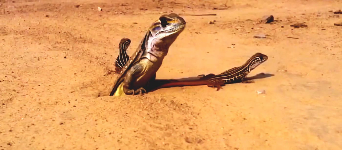 เหล่าแย้ผงกคองึกงักราวกับจะทักทาย มองดูแล้วน่าขบขันปนน่าเอ็นดู ใครจะรู้ล่ะว่าจริง ๆ มันกำลังโมโหอยู่นะ! ถ้าเป็นสุนัขแล้วล่ะก็ เวลามันแย่งอาณาเขตกัน ขั้นแรกมันก็จะปัสสาวะไว้ ทิ้งกลิ่นไว้เป็นการเตือนไม่ให้ตัวอื่นเข้าใกล้ และหากมีใครอาจหาญมาท้าทาย มันก็จะแยกเขี้ยวขู่ หูลู่ไปข้างหลัง หางตั้งเกร็ง น่ากลัวเสียจนเจ้าของอย่างฉันยังไม่อยากจะเข้าไปใกล้เพราะกลัวจะโดนมันกัด แต่แย้เหล่านี้แสดงออกถึงการหวงอาณาเขตด้วยการผงกหัว ในสายตาของฉันมันน่าเอ็นดูมากกว่าน่ากลัวมาก ถึงอย่างนั้น ในสายตาของแย้กันเอง การผงกหัวคงเป็นสัญญาณเตือนที่น่ากลัวไม่น้อย เพราะหากหนักเข้าล่ะก็ ถึงขนาดกัดกันเสียจนเลือดตกยางออกเลยทีเดียว