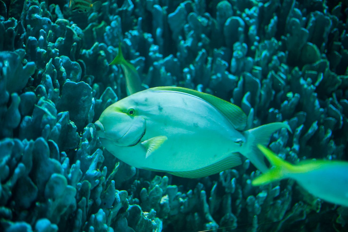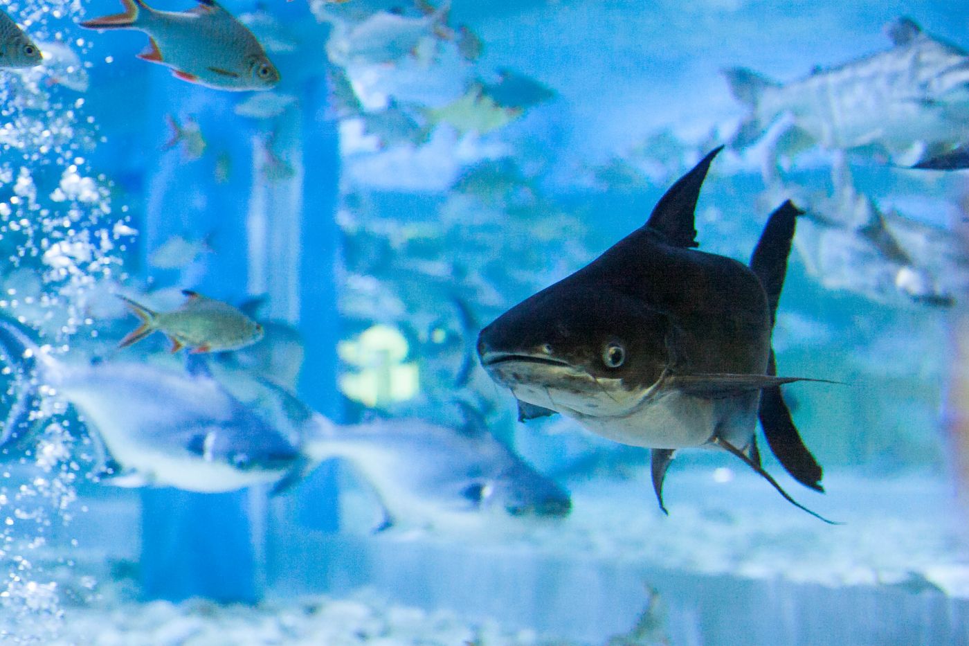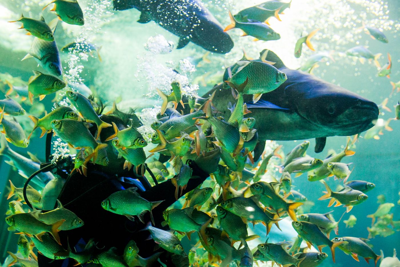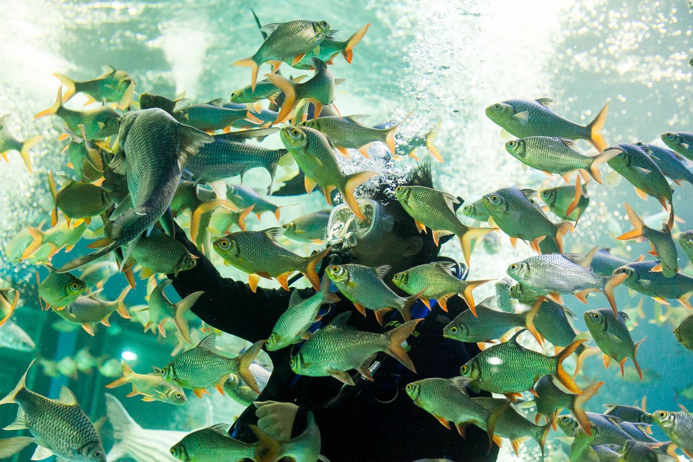 ฉันยืนอยู่โซนเวทีปลาน้ำจืด หน้าตู้กระจกใสใบใหญ่ ที่มีปลานับร้อยตัวกำลังรุมล้อมนักประดาน้ำ ได้เวลาอาหารเช้าแล้ว ชีวิตของปลาตู้กระจกไม่จำเป็นต้องออกหาอาหารเอง ปลาในตู้อยู่ด้วยกันฉันเพื่อน พวกเขากำลังกินปลาสีกุนสับที่นักประดาน้ำเตรียมมาให้ นักท่องเที่ยวต่างหยุดชมการแสดงให้อาหารปลา บ้างถ่ายรูป บ้างยืนชมด้วยตาเปล่า