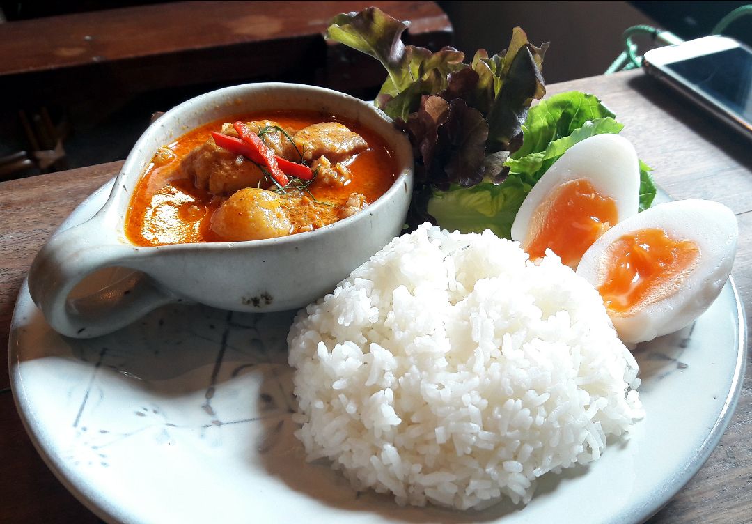 ส่วนเพื่อนเราสั่งข้าวพะแนงหมูใส่ลิ้นจี่ ถือว่าเค้าครีเอทดีทั้ง2เมนูนี้เลยนะ ข้าวสวยร้อนๆ กับแกงพะแนงหมูลิ้นจี่เสิร์ฟพร้อมไข่ต้มยางมะตูมนุ่มๆ และที่ขาดไม่ได้เลยคือผักสลัดสดๆ ตามคอนเซ็ป FARM to TABLE เราลองชิมดูก็อร่อยดีเลยแหละ เนื้อลิ้นจี่นิ่มดีมากๆ แต่มันกลืนไปกับพะแนงแบบไม่รู้สึกถึงรสชาติลิ้นจี่เลย ไม่รู้ว่าเค้าตั้งใจใส่มาเป็นองค์ประกอบเฉยๆ หรือเปล่านะ คือไม่ได้ต้องการให้มันมีรสชาติโดดเด่นไรงี้