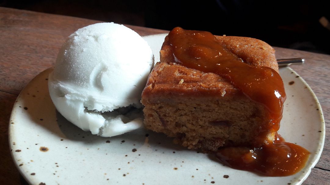และแล้วก็ถึงเวลาที่เรารอคอย กินของคาวแล้วก็ต้องกินของหวานต่อ นี่แหละของถนัด อิอิ ของเพื่อนเราสั่งเค้กมะตูมกินคู่กับไอศครีมมะพร้าวอัญชัน (เป็นเมนูที่เสิร์ฟพร้อมไอศครีม เลือกรสชาติไอศรีมได้เอง แต่จะให้พนักงานแนะนำรสชาติที่เข้ากับเมนูให้ก็ได้ วันนั้นมีไอศครีมมาให้เลือกถึง7รสเลยแหละ) เค้กมะตูมเค้าอุ่นมาร้อนๆ ราดซอสมะตูมที่ช่วยเสริมรสชาติให้เค้กมะตูมได้อย่างดี๊ดีล่ะคุณผู้โชมมม ไอศครีมมะพร้าวอัญชันก็อร่อยแต่เพื่อนคอมเม้นว่าสีม่วงของอัญชันน่าจะเข้มกว่านี้เพราะอันนี้สีมันยังขาวๆอยู่เลย