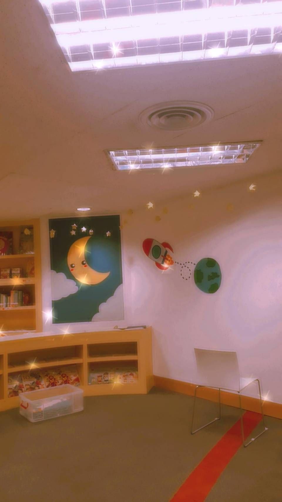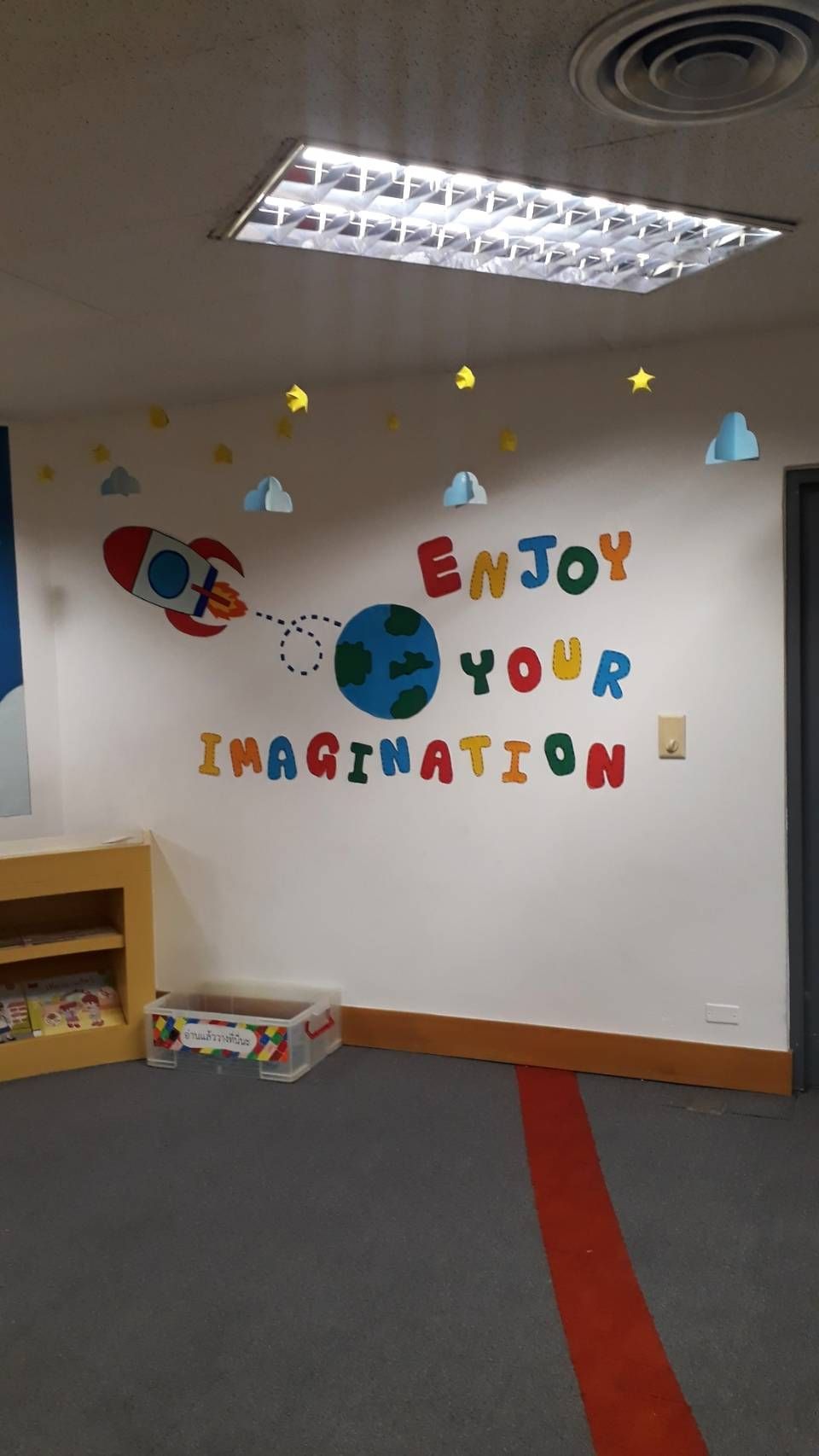 วันนี้ก็เป็นอีกวันที่พวกเราเริ่มตกแต่งส่วนที่เหลือภายในห้อง ก็จะประกอบไปด้วย โลก จรวด ดาว ก้อนเมฆ