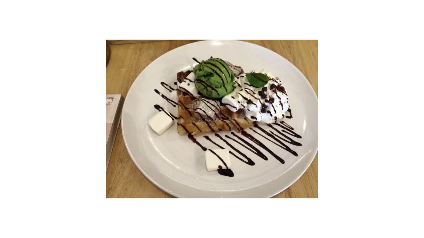 เครปไอติมชาเขียวมาร์ชเมลโล่ รสชาติมาร์ชเมลโล่ละลายในปาก เครปกรอบนอกนุ่มในและไอศครีมชาเขียวก็อร่อยแบบผงมัจฉะ