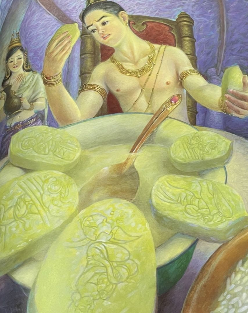 ส่วนพ่อแม่ของฝ่ายพระสังข์ก็ออกตามหาลูก และแม่วางอุบายแกะสลักเรื่องราวผ่านฟักไปให้ลูกเห็น เมื่อลูกเห็นเรื่องราวพบว่าพ่อแม่มาตามลูกกลับเมืองแล้ว