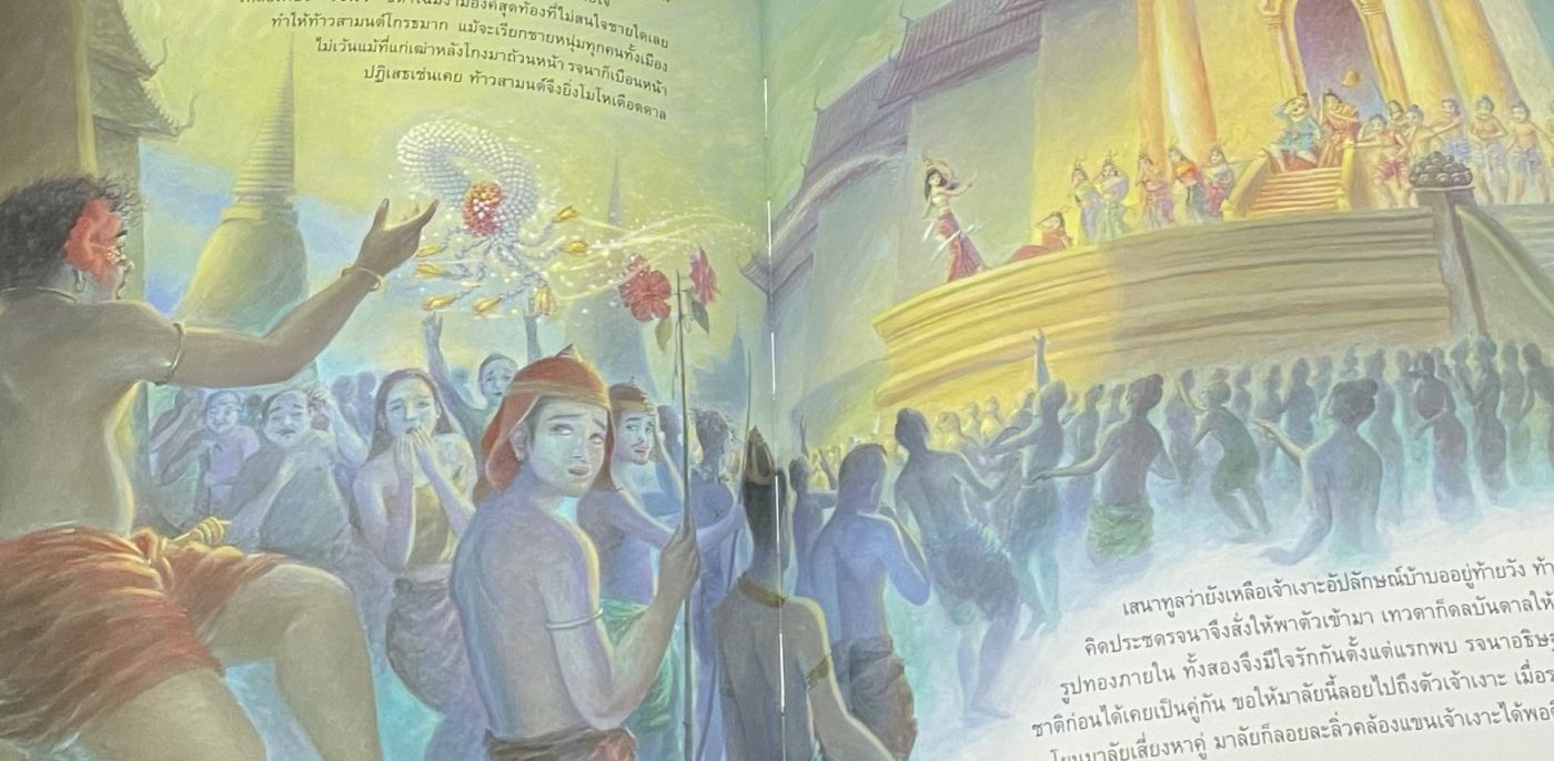 พระสังข์ในคราบเงาะป่าเดินทางตามคำขอให้ไปงานที่มีการเสี่ยงท้ายเลือกคู่ของนางรจนา เมื่อนางรจนา พระธิดาคนเล็กของท้าวสามนต์และมเหสีมณฑาเห็นเงาะป่าก็พบถึงรูปลักษณ์ภายในที่แท้จริงและเสี่ยงพวงมาลัยให้ ซึ่งทั้งคู่ใจตรงกัน รักกัน แต่สร้างความอับอายให้กับพ่อแม่มาก เลยขับไล่ทั้งสองออกไป