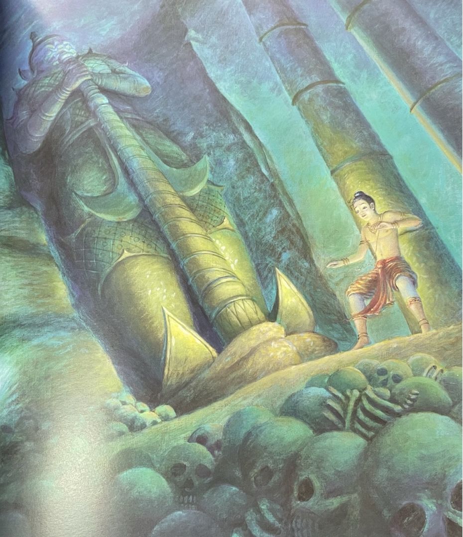 นางยักษ์รักพระสังข์ดุจดั่งลูกในอุทรจริงๆ และในวันหนึ่ง พระสังข์พบความจริงว่า แม่เลี้ยงเป็นยักษ์ เลยตัดสินใจชุบตัวเองด้วยทองคำและขโมยเงาะป่าหนีไป เมื่อนางยักษ์ตามมาถึง ขอร้องให้กลับพร้อมตนแต่พระสังข์ไม่ยอมกลับ นางเสียใจมาก จนตรอมใจตาย และก่อนที่นางตายก็ได้ร่ายมหาจินดามนต์ ซึ่งพระสังข์ลงมามากราบลาแม่เลี้ยงก่อนจำมนต์นี้ได้ขึ้นใจ