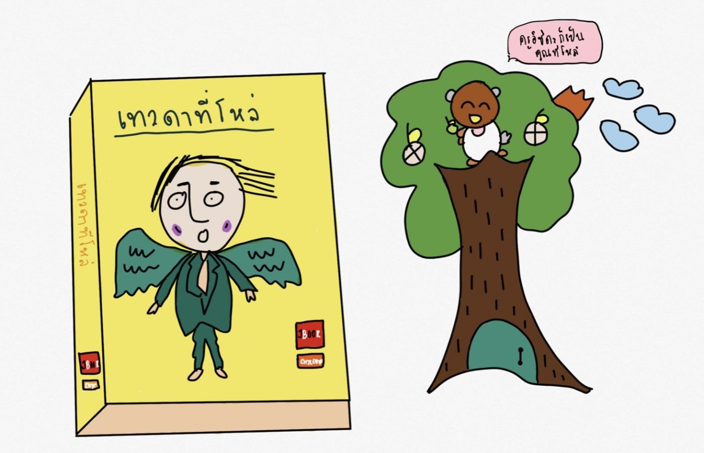 - "เด็กทุกคนในห้องอยากเป็นที่โหล่เพราะจะได้เห็นเทวดาที่โหล่ เเละเมื่อเห็นเทวดาที่โหล่แล้วยังสามารถโทรจิตคุยกันได้ด้วย"