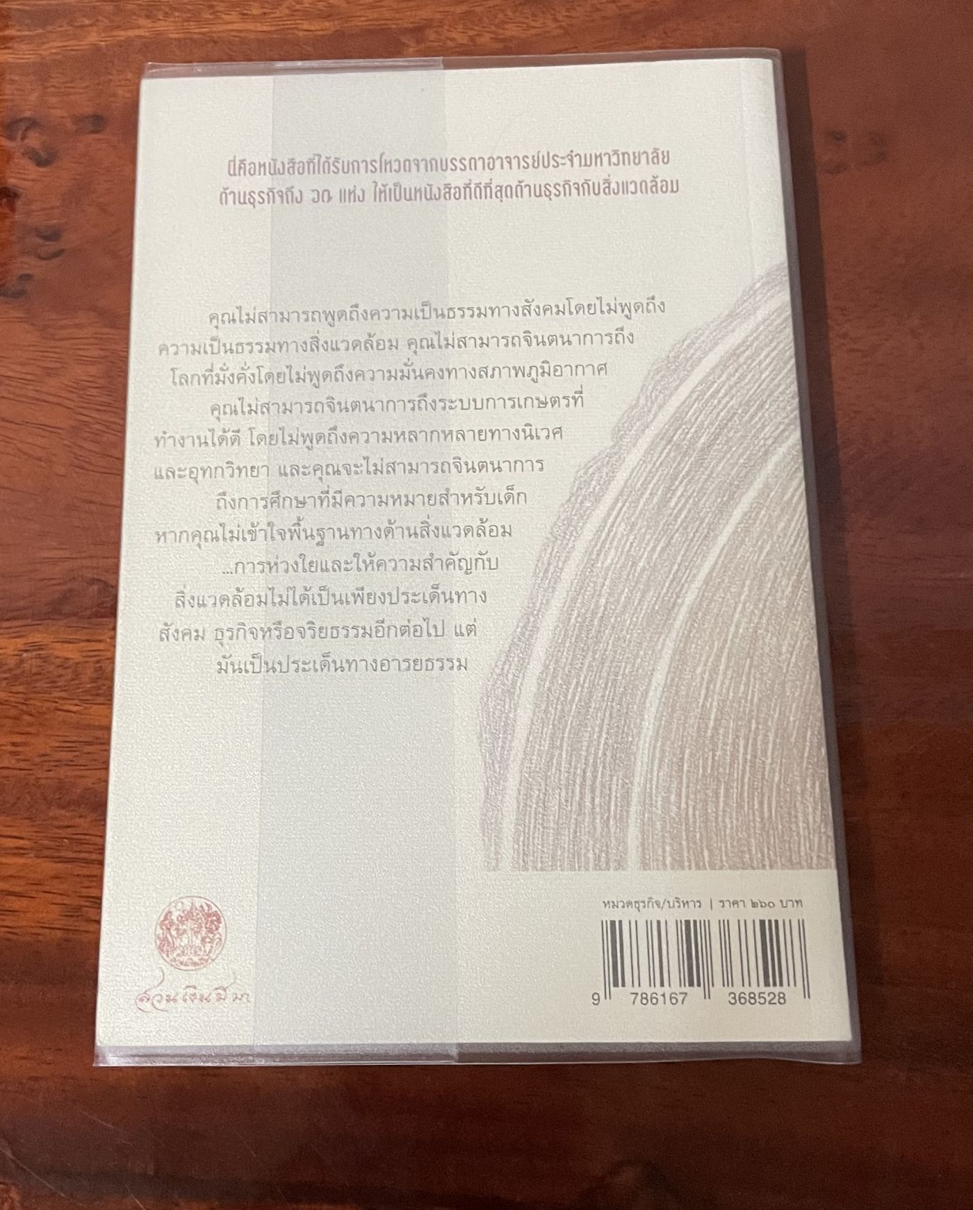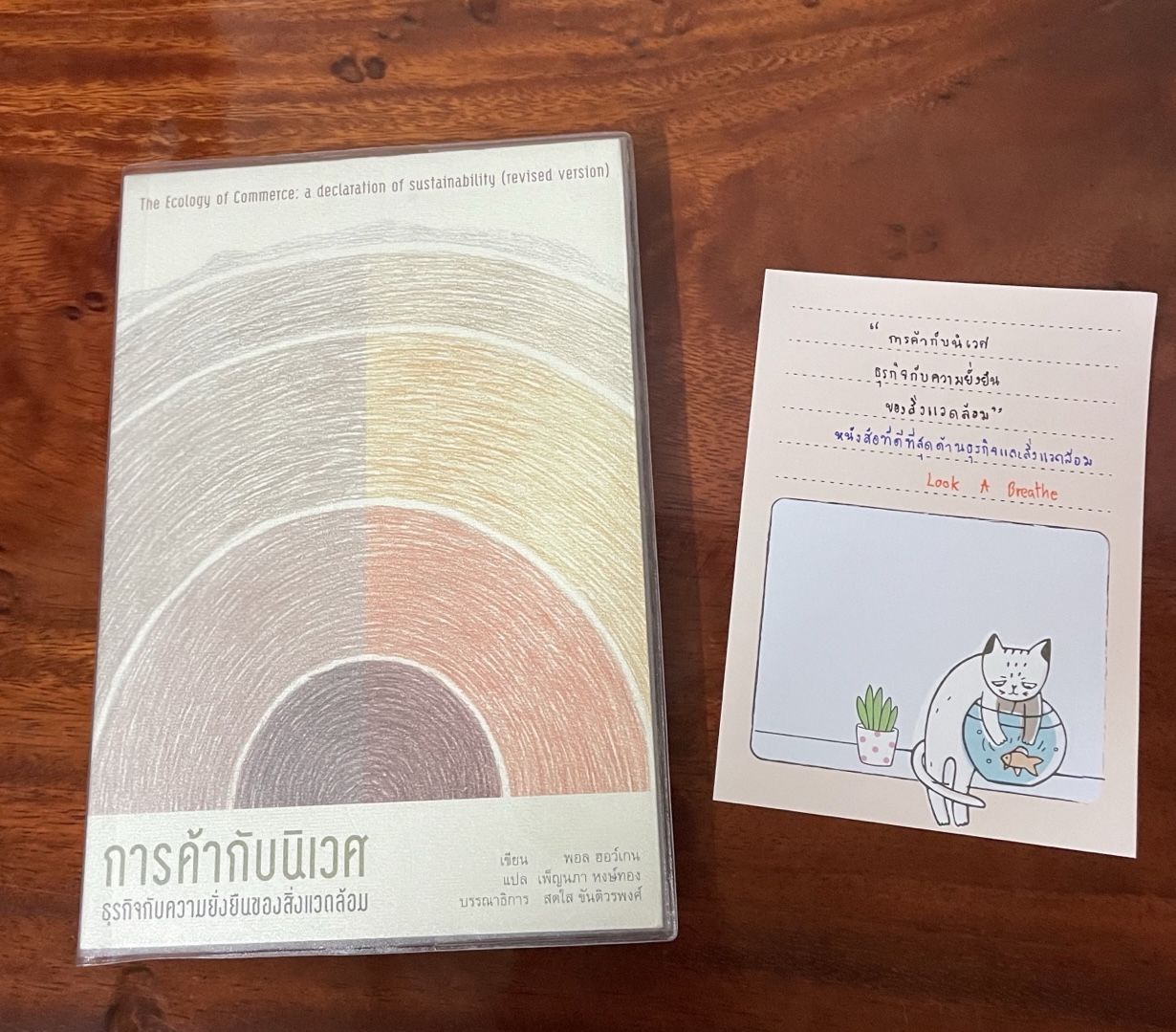 ธุรกิจกับสิ่งแวดล้อม ดูไม่มีทางเข้ากันได้ แต่พออ่านหนังสือเล่มนี้เสร็จแล้ว ก็เเอบคิดเปรียบเทียบในใจว่า ธุรกิจเปรียบเหมือนคนแบก และสิ่งแวดล้อมเปรียบเหมือนหม้อน้ำ เพราะว่า คนแบกหม้อน้ำพาไป และไม่ได้แบกธรรมดา แต่นำหม้อน้ำที่อยู่ในมือไปรดน้ำต้นไม้ให้สิ่งแวดล้อมดีควบคู่ไปด้วย