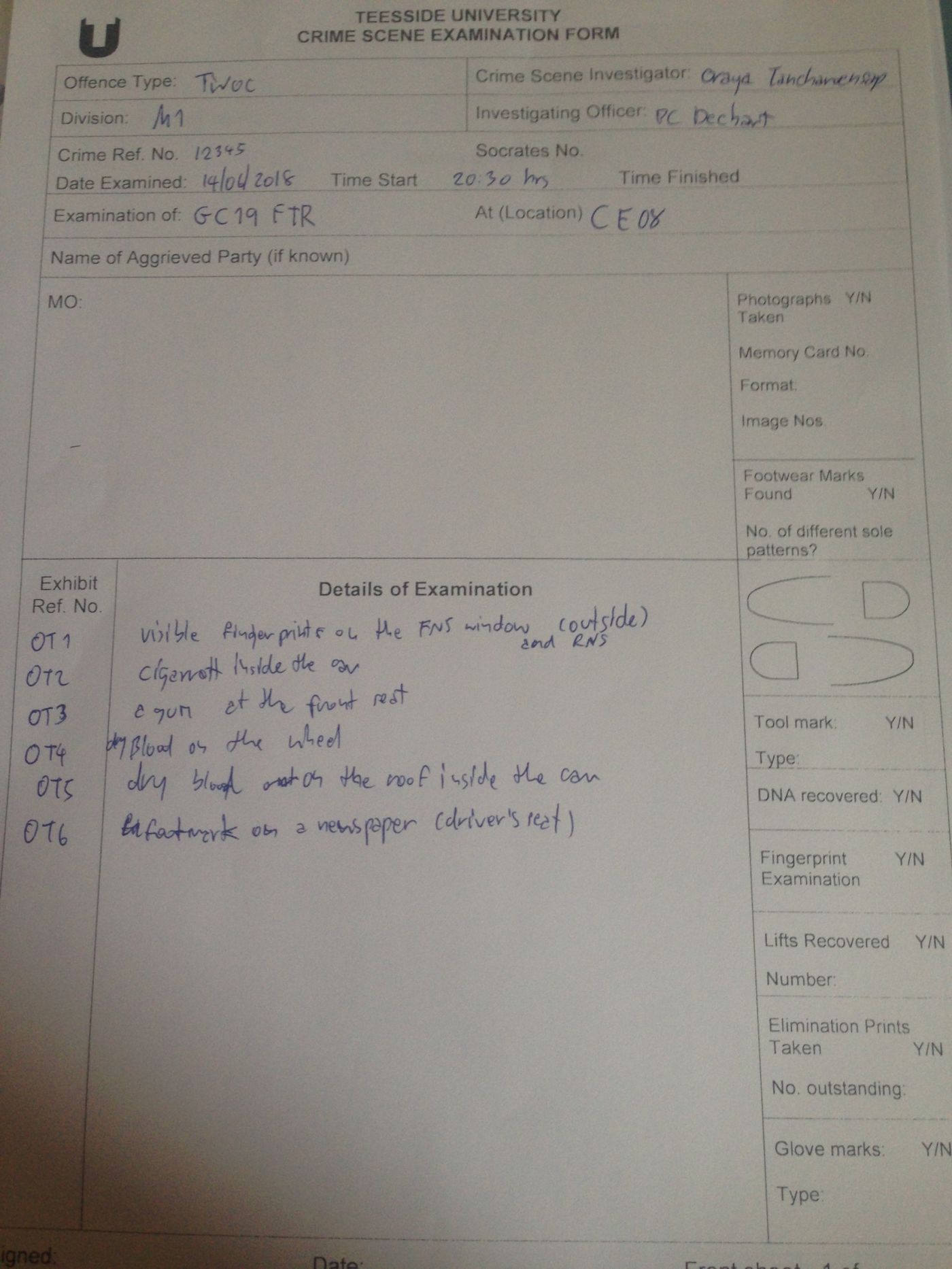ตอนตรวจสอบรถยนต์อาจารย์บอกว่ายังไม่เน้นเรื่อง MO อาจารย์อยากให้เราดูว่าในรถมีหลักฐานอะไรให้เราเก็บได้บ้าง อาจารย์ให้จับกลุ่มช่วยกันตรวจสอบค่ะ อย่างแรกที่เห็นเลยคือรอยนิ้วมือบนหน้าต่างรถยนต์ (ใช้แสงไฟฉายช่วยจะมองได้ดีขึ้น) พอเปิดประตูรถก็จะเห็นพวกก้นบุหรี่ รอยรองเท้าเปื้อนเลือดบนกระดาษหนังสือพิมพ์ รอยเลือดแห้งบนพวงมาลัยและหลังคารถ (จริงๆ แล้วเราจะระบุว่าเป็นรอยเลือดไม่ได้จนกว่าจะตรวจสอบ) เป็นต้น