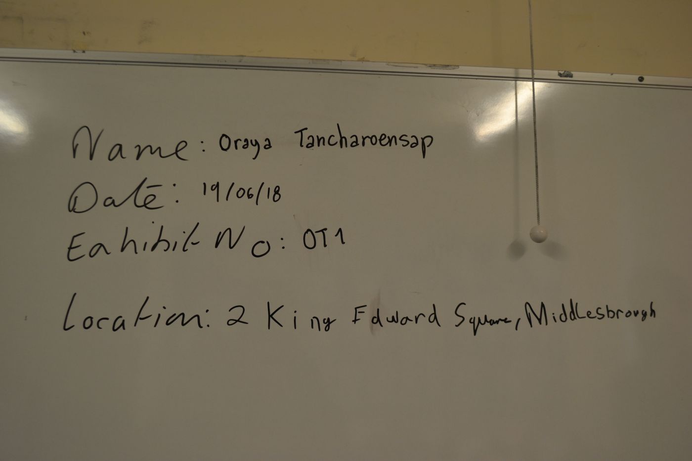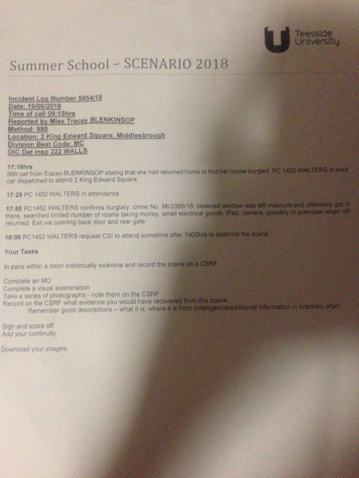 จากนั้นอาจารย์ก็แจกกล้องคนละตัวและใบ CSRF และจับคู่ไปตรวจสอบที่เกิดเหตุ (มีจัดไว้หลายห้อง) ห้องที่ออยล์ได้หน้าตาตามภาพเลยค่ะ อย่างแรกที่เราต้องทำคือการเขียน MO