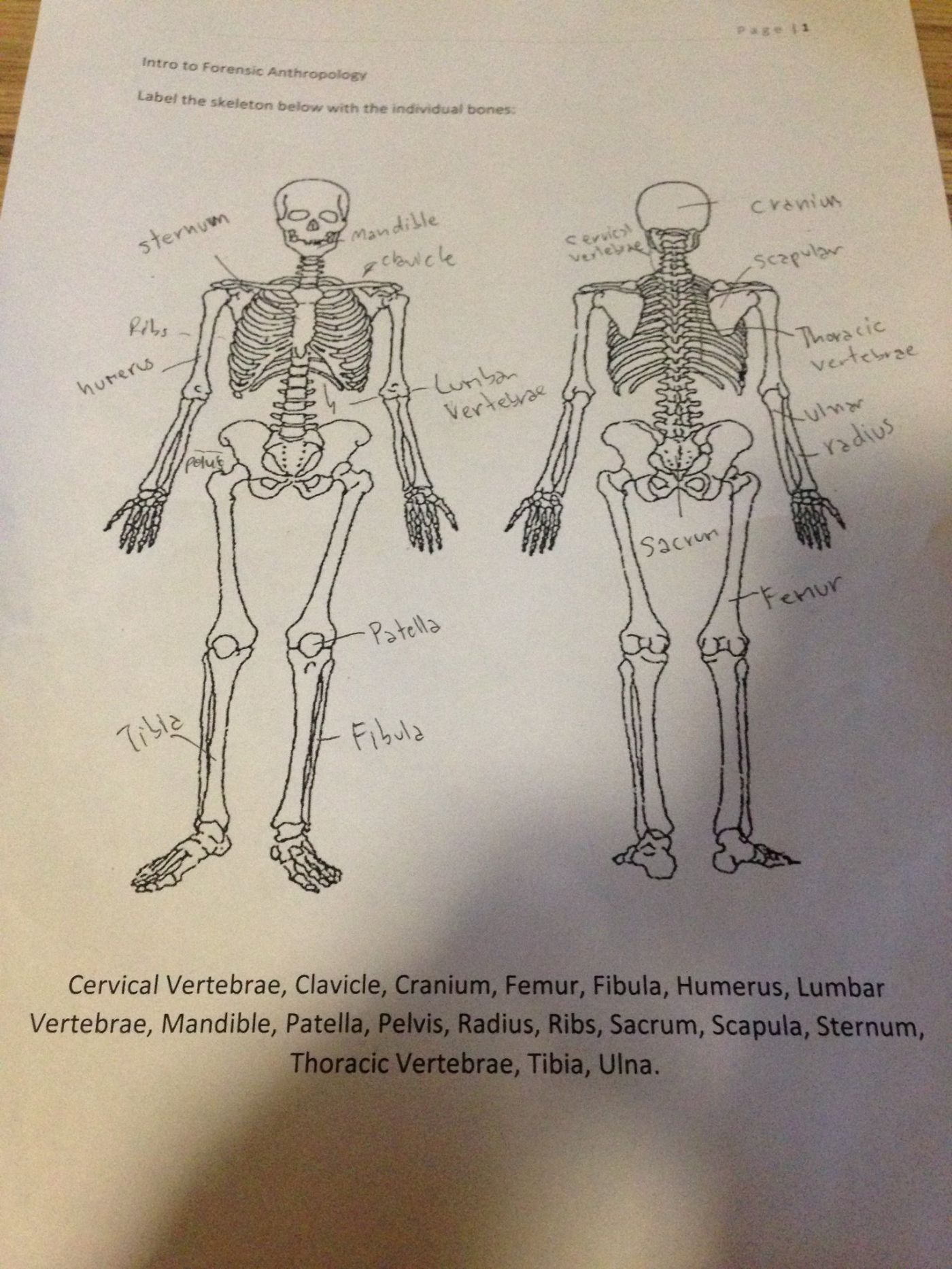 เป็นโครงกระดูกมนุษย์หรือสัตว์ อาจารย์นำโครงกระดูกจำลองของนกมาให้ดู (เนื่องจากที่นี่นกนางนวลเยอะมาก) รวมทั้งสัตว์อื่นๆ ด้วย ถ้าเป็นกระโหลกศีรษะแน่นอนว่าแยกง่าย ยกเว้นไปเจอกระโหลกศีรษะลิงที่ค่อนข้างคล้ายมนุษย์
