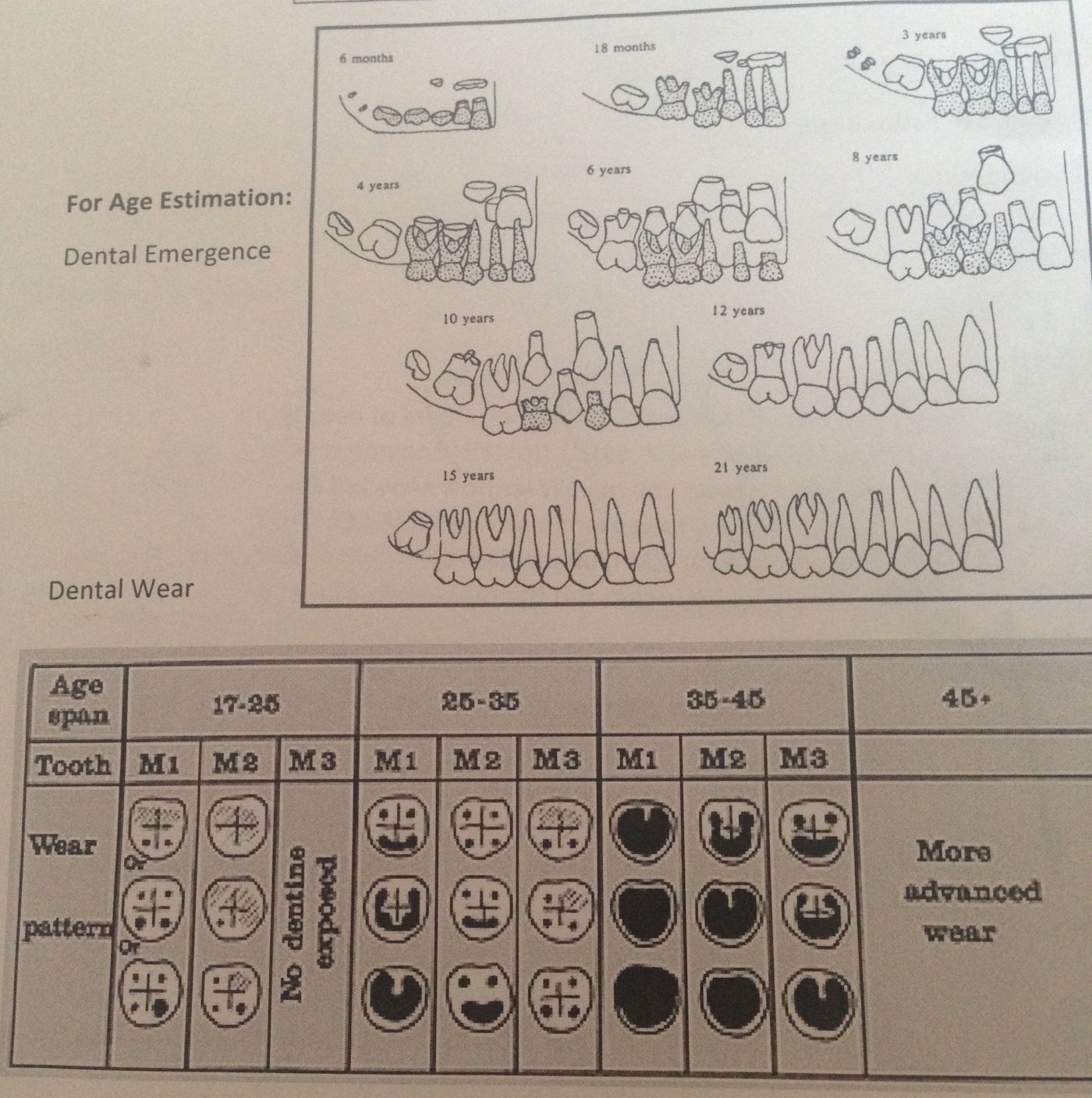 สำหรับการดูเรื่องอายุนั้นเราวิเคราะห์จากสองอย่างคือ การเจริญเติบโตและการเสื่อมสภาพ เราดูอายุที่ฟัน (ไม่มีอะไรบอกอายุได้ดีเท่าฟันอีกแล้วค่ะ มันเป็นส่วนที่ไม่ว่าร่างกายจะเป็นอะไรยังไง ฟันจะเติบโตตามปกติ โครงกระดูกที่ออยล์ได้มันน่าสนใจตรงนี้ เดี๋ยวกล่าวถึงตอนท้ายที่อาจารย์มาสรุป) พอฟันแท้ขึ้นครบแล้ว เราจะดูเรื่องการเสื่อมสภาพของฟันแทน