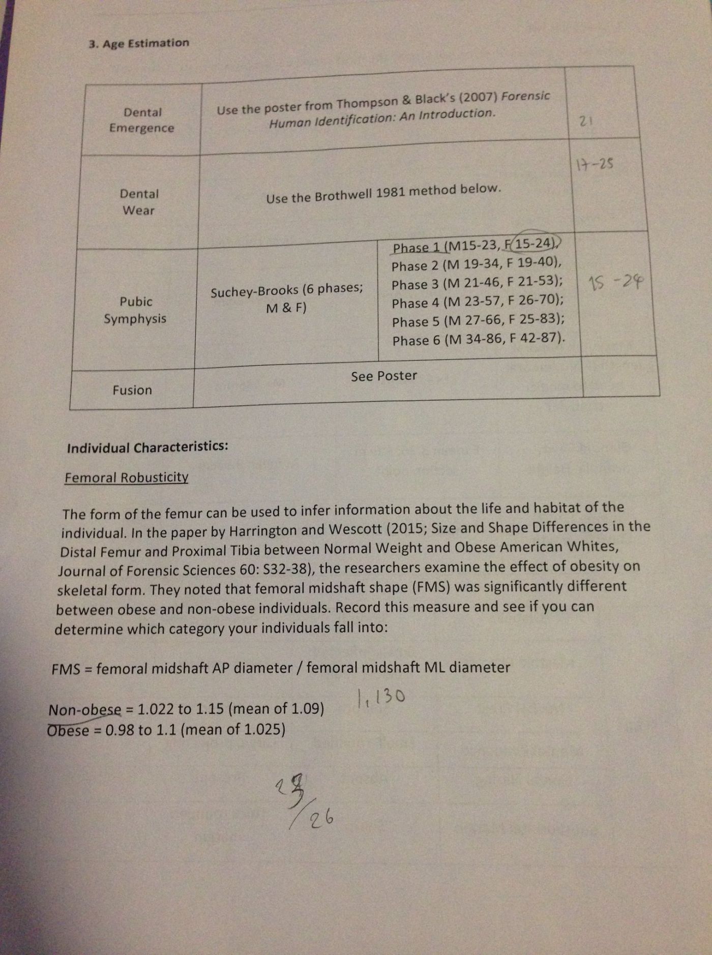เพื่อไม่ให้งง (หรือยิ่งเพิ่มความงง) ลงภาพที่อาจารย์ให้กรอกค่ะ โดยข้อมูลที่ใส่เป็นข้อมูลจากโครงกระดูกที่เรียงกันเมื่อครู่ ส่วนกะโหลกออยล์กรอกไม่ได้เนื่องจากไม่มี สเกลที่ใช้คือ 1 -> 5 โดยที่ 1 คือ female และ 5 คือ male ส่วน 3 คือไม่รู้