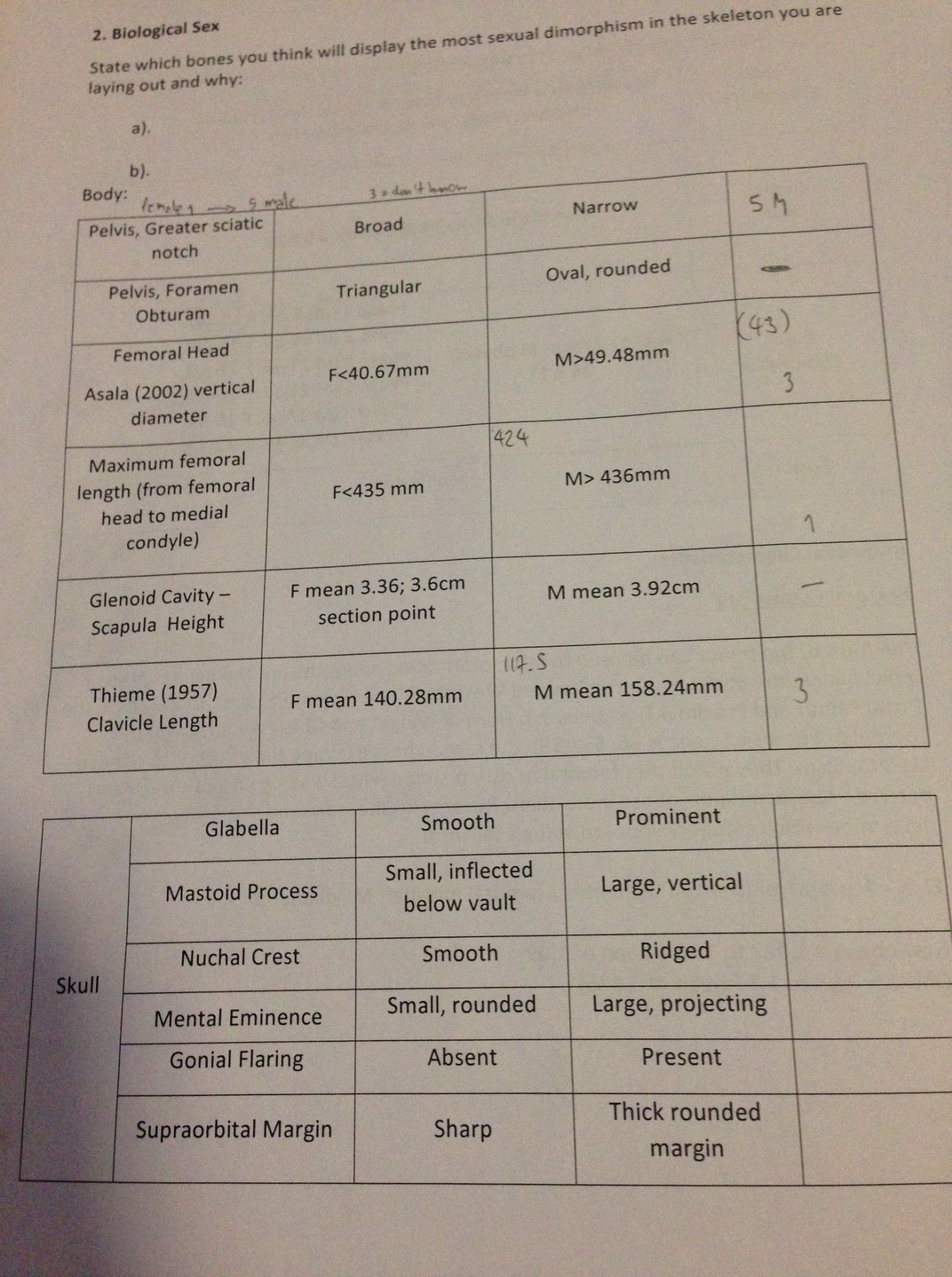 หลังจากเรียงเสร็จก็มานั่งฟังบรรยายต่อ ที่นี่เราก็จะเข้าเรื่องกันแล้วว่าโครงกระดูกบอกอะไรเราได้บ้าง อย่างแรกเลยเราต้องแยกก่อนว่าเป็นหญิงหรือชายตาม Biological Sex ที่ต้องเน้นเรื่อง biological เพราะบางคนอาจแปลงเพศมาแล้ว แต่โครงกระดูกจะยังคงสภาพตาม biological sex อยู่