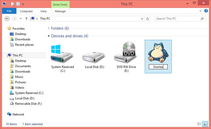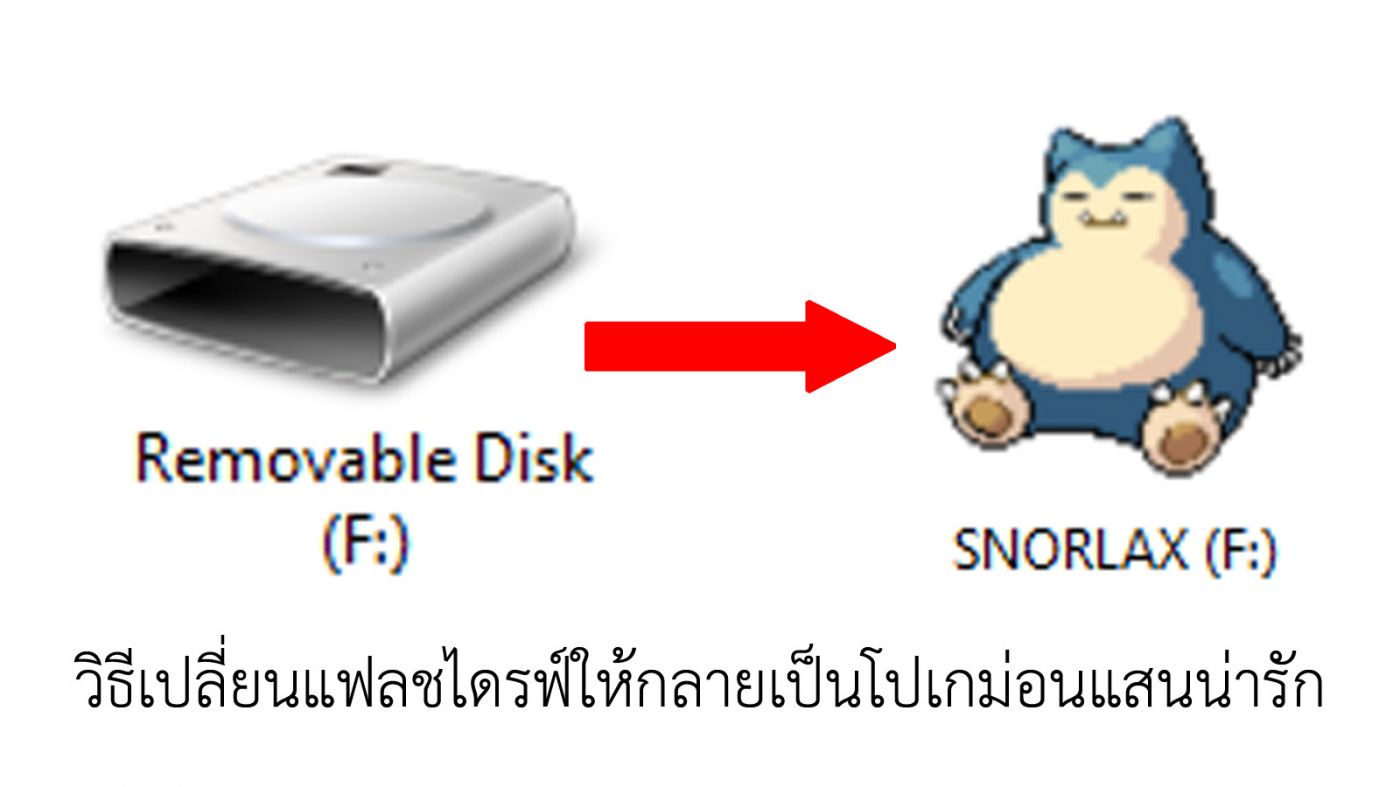 จากนั้นให้ Safety Remove แฟลชไดรฟ์ตามปกติ แล้วเสียบเข้าไปใหม่อีกครั้ง ที่หน้าจอ My Computer จะขึ้นรูปโปเกม่อนที่ต้องการ แต่ยังไม่เสร็จ คลิก 2 ครั้งช้าๆ ที่ชื่อของไดรฟ์ จะเป็นการเปลี่ยนชื่อ ตั้งชื่อที่ต้องการ เสร็จสมบูรณ์ ได้แฟลชไดรฟ์โปเกม่อนที่แสนน่ารักแล้ว