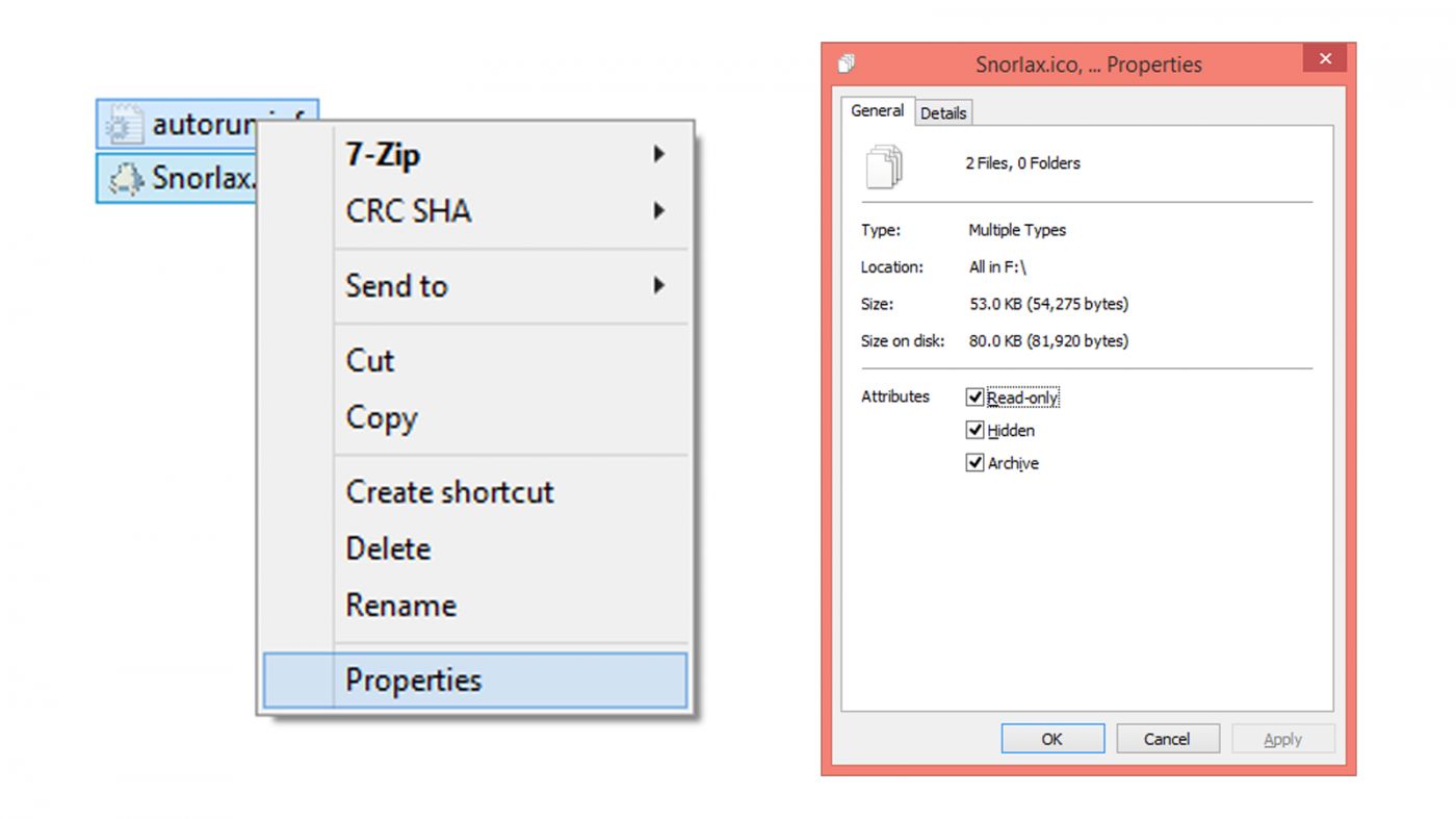 จากนั้นนำไฟล์ไอค่อน และไฟล์ autorun.inf ไปวางไว้ที่หน้าแรกสุดของแฟลชไดรฟ์ คลิกขวาของทั้ง 2 ไฟล์ เลือก Properties ติ๊กเครื่องหมายถูกที่ Read-only และ Hidden กด OK