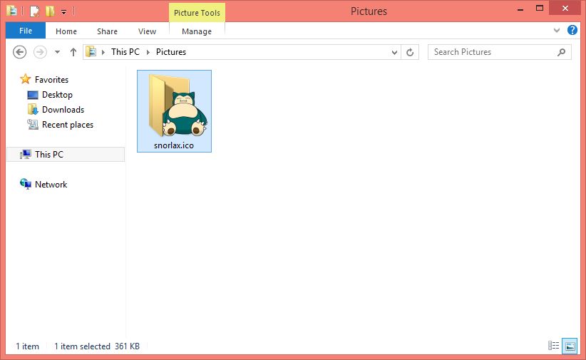 เมื่อได้ไฟล์ไอคอนแล้ว แก้ไขชื่อไฟล์ให้สั้นที่สุด (ในตัวอย่างตั้งว่า snorlax.ico) ตรวจสอบว่ารูปที่ได้นั้นใช้งานได้ โดยการคลิกเลือกไฟล์ไอค่อนว่าแสดงผลโอเคหรือไม่ หากพื้นหลังมีสีขาวหรือดำ แสดงว่าทำไม่ถูกตามขั้นตอน หรือไฟล์รูปต้นฉบับไม่ได้โปร่งใสมาตั้งแต่แรกแล้ว