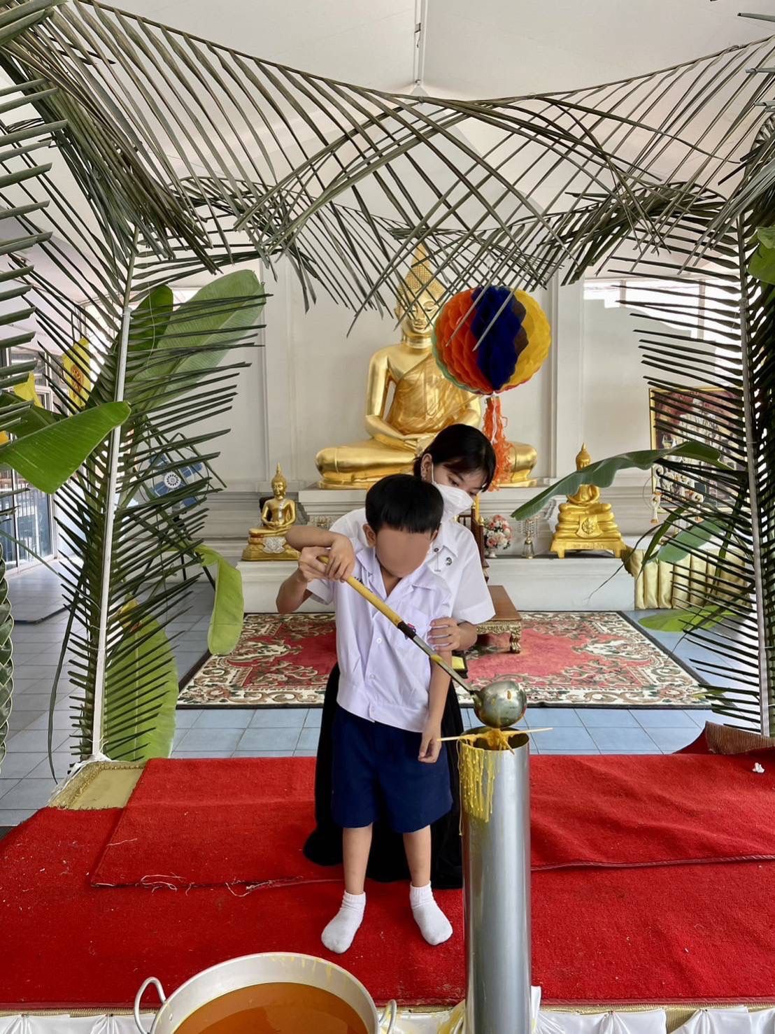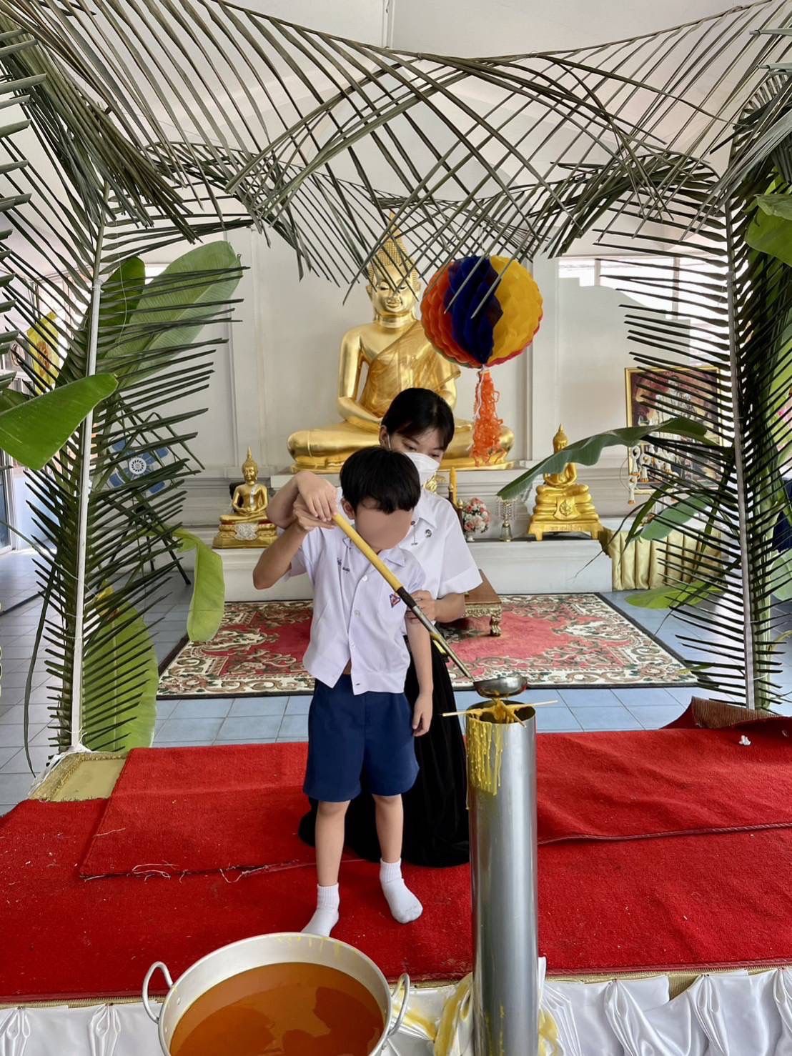 ในอาทิตย์ที่เก้าและสิบ เราจะได้เจอทั้งเด็กอนุบาลสาม อนุบาลสอง และอนุบาลหนึ่งครบทุกชั้น แต่อาจจะไม่ครบทุกห้อง เริ่มจากอาทิตย์ที่เก้า เราจะเจอพี่ อ.3/2 - อ.3/4 และน้อง อ.2/1 - อ.2/2 ในอาทิตย์นี้เด็กนักเรียนจะเรียนหน่วยการเรียนรู้บ้านแสนสุข นิทานที่เรานำไปเล่า คือ บ้านเรามีเงาประหลาด นิทานเล่มนี้เด็กๆ ชื่นชอบมากเพราะถ้าดูจากหน้าปกหนังสือหรือรูปภาพแล้ว จะมีพวกสัตว์ประหลาด สิ่งลึกลับอยู่ในบ้าน เด็กๆ จะตื่นเต้นมากเกี่ยวกับเรื่องพวกนี้ นั่งฟังกันอย่างตั้งใจ และเด็กนักเรียนก็มีส่วนร่วมมากขึ้น ทุกครั้งที่เราเล่านิทานจบแล้ว เราจะทบทวนเด็กๆ เสมอว่าเป็นนิทานเกี่ยวกับอะไร ใคร ทำอะไร ที่ไหน ตัวละครชื่ออะไร ซึ่งเด็กจะสามารถตอบได้หมดเลย ใจฟูมากๆ เวลาที่เห็นพวกเขาตอบคำถาม มีส่วนร่วม และสนุกกับนิทานที่นำไปเล่า ในอาทิตย์นี้เรามีกิจกรรมหล่อเทียนพรรษา วันอังคารที่ 18 ก.ค. 66 เราอยู่ห้อง อ.3/3 จะให้เด็กนักเรียนนำเทียนสีเหลืองมาคนละกี่เล่มก็ได้ และจะพาไปหล่อในตอนเช้าหลังจากที่ทำกิจกรรมตอนเช้าเสร็จแล้ว จะเรียงจากน้อง อ.1 - อ.3 ตามลำดับ ซึ่งใช้เวลานานพอสมควรเลยค่ะ คุณครูเลยให้พาเด็กขึ้นไปดื่มนมและทำงานก่อน พอถึงเวลาแล้วก็พาเด็กลงไปหล่อเทียน โดยเริ่มจาก อ.3/1 และไล่ไปเรื่อยๆ พอถึงห้องเราแล้วคุณครูก็แบ่งเด็กๆ ให้ถ่ายรูปทั้งกับคุณครู พี่เลี้ยง และเราค่ะ และนี่เป็นรูปภาพที่คุณครูถ่ายให้ตอนพาเด็กนักเรียนหล่อเทียน