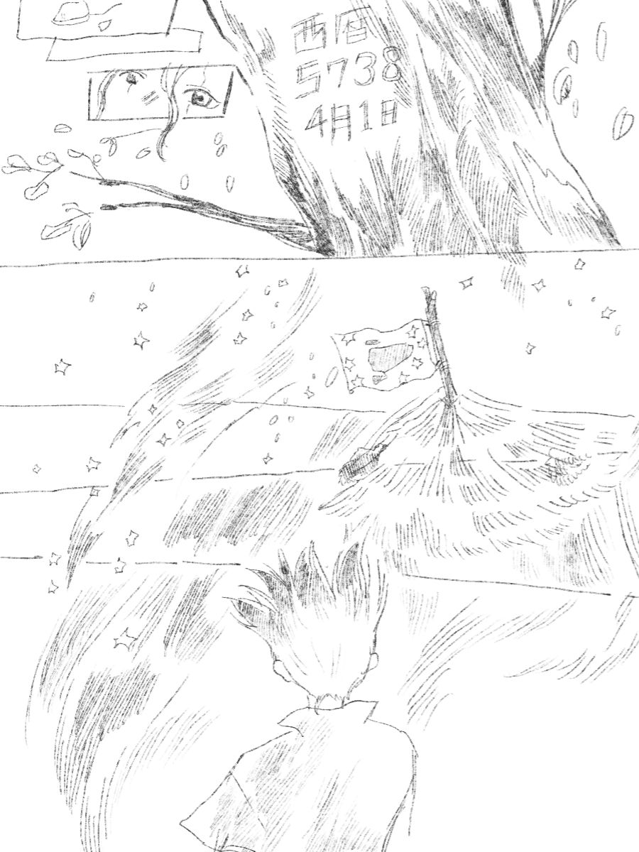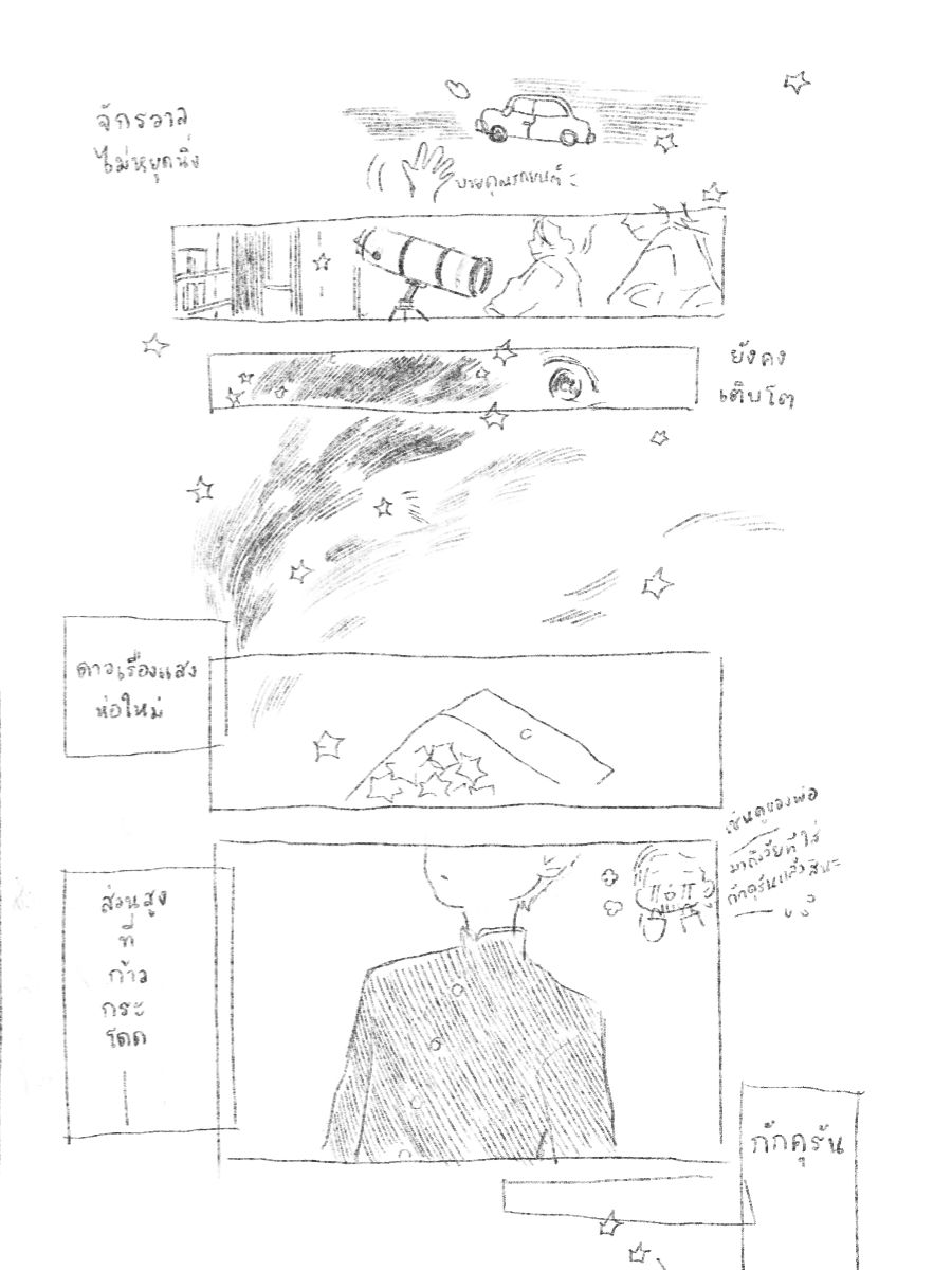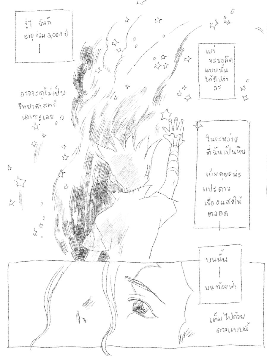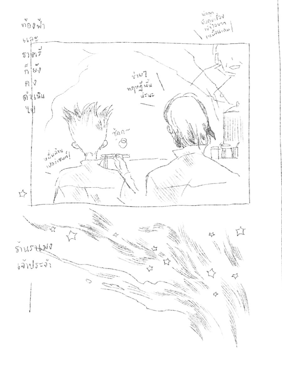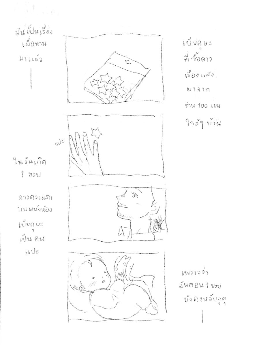 - ที่มาของคอมมิคนี้มาจากภาพนี้ที่วาดไว้สักพักแล้ว เราชอบดาวเรืองแสงค่ะ (แบบว่า เป็นของที่ติดไม้ติดมือจากร้านชำแถวหอพัก รู้ตัวอีกทีก็เอาไปจ่ายเงินแล้ว) เลยอดไม่ได้ที่จะวาดลงไป พอนึกถึงเบื้องหลังว่า อืม พวกเขาจะติดดาวนี้กันยังไงน้า เบียคุยะซังเป็นคนติด? หรือเซ็นคูนะ สตอรี่ของคอมมิคข้างบนก็แว๊บเข้ามาในหัว คีย์เวิร์ดก็คือ ดาวเรืองแสง, ร้านร้อยเยน, เบียคุยะที่ชอบเดินดูของไปเรื่อยเปื่อย, มือใหญ่และมือเล็กที่แปะดาว, การสร้างจักรวาลที่เริ่มต้นในห้องเล็กๆ