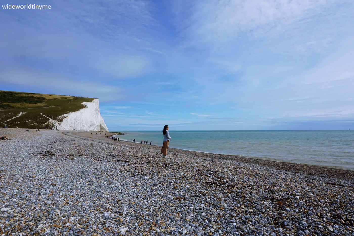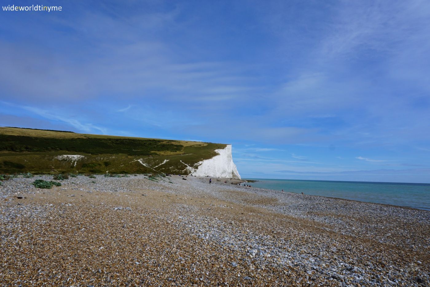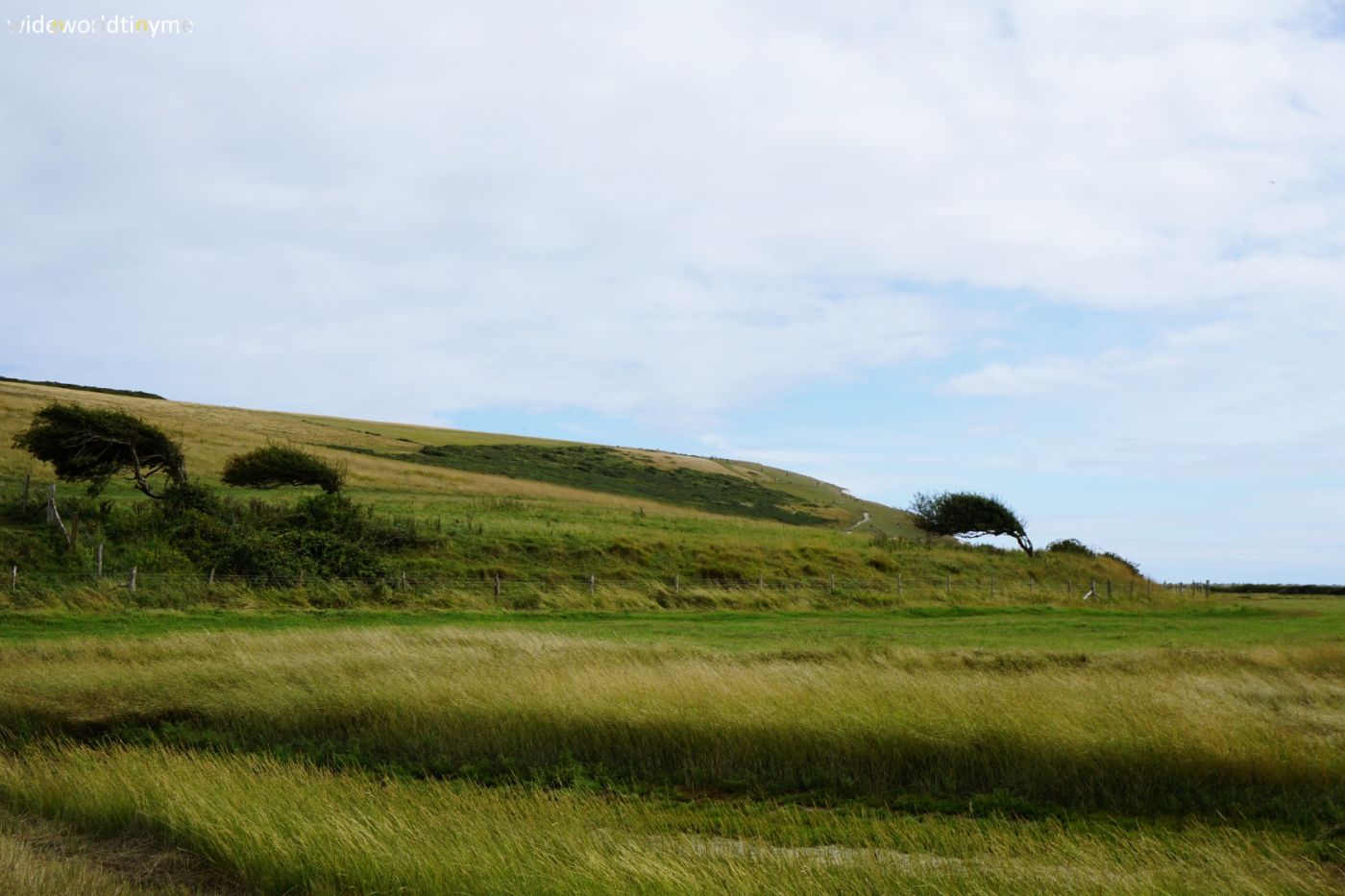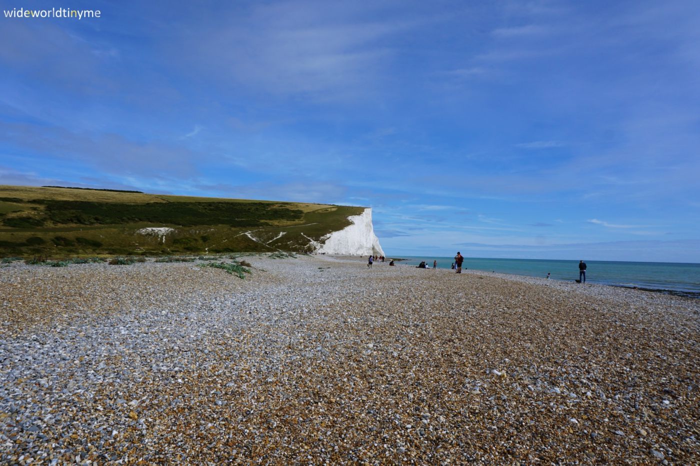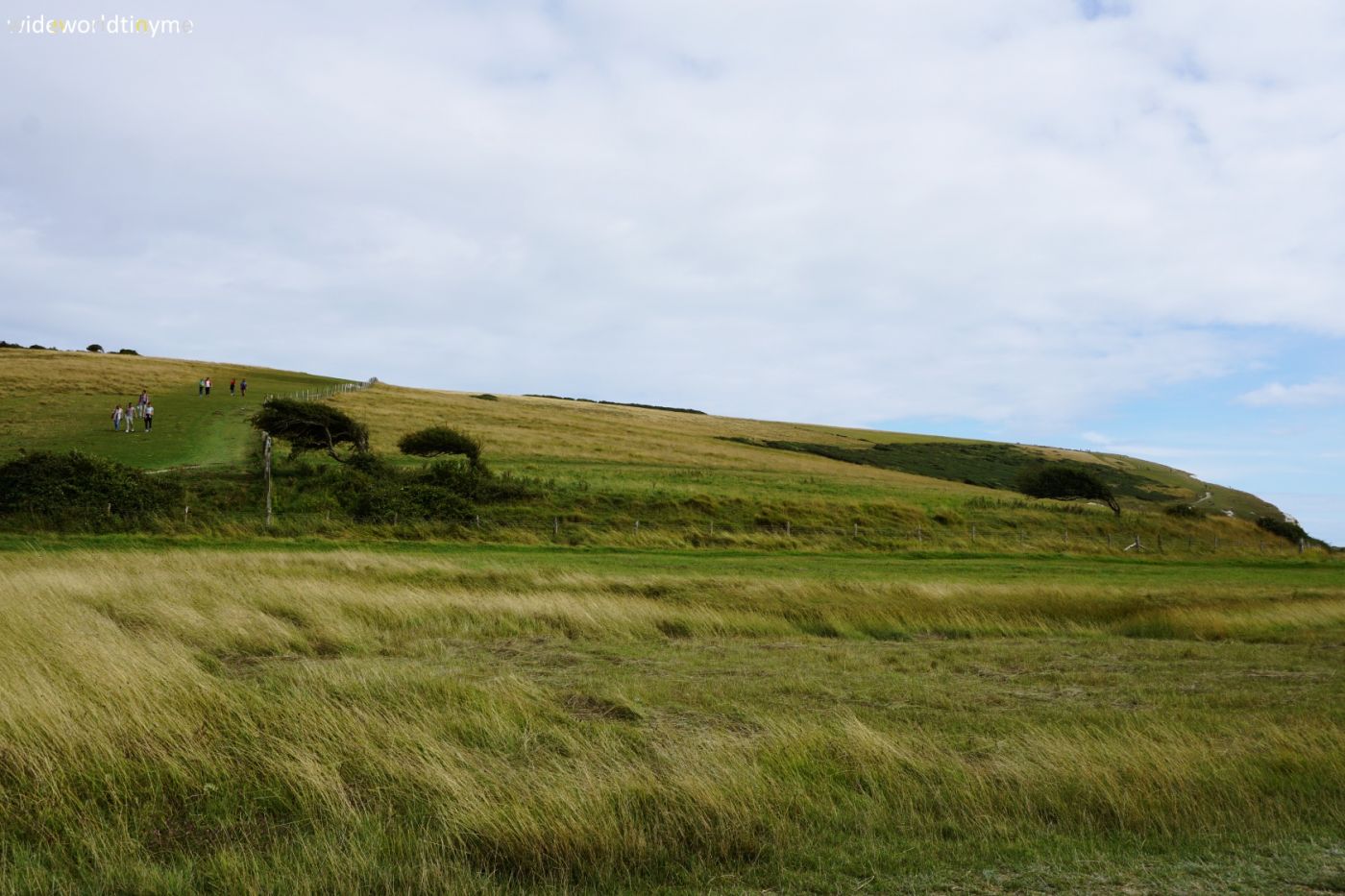 เราเลือกระหว่างสองทางคือจะเดินขึ้นทางลาดชันไม่มากไปเรื่อยๆ เพื่อไปจุดสูงของหน้าผา Seven Sisters หรือเราจะเดินทางราบผ่านทุ่งหญ้าไปชายหาดหินเพื่อชมหน้าผาหินตัด Seven Sisters ซึ่งเราก็เลือกทางหลัง เดินไปถ่ายรูปไป เจอแกะบ้าง ต้นไม้ที่เหมือนต้นบอนไซขยาย เพราะโดนแรงลมจนเอียงเป็นรูปร่างลู่ลมไปแล้ว แล้วเราก็มาถึงชายหาดหินพร้อมทะเลให้เรามองสุดสายตา และด้านซ้ายก็คือหน้าผา Seven Sisters ที่เราอยากจะมานี่แหละ