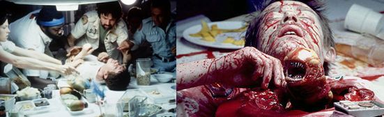 และฉากการให้กำเนิดฉากสุดท้ายอันเป็นฉากโหดในตำนานอันเลื่องชื่อของภาพยนตร์เรื่องนี้ที่ทำเอาหลายคนต้องปิดตา ฉากการตายของเคน เมื่อสัตว์ประหลาดตัวนั้นปลดปล่อยพันธนาการออกจากใบหน้าของเขาแล้ว เคนสามารถกลับมาใช้ชีวิตได้ปกติอีกครั้ง แค่เพียงช่วงเวลาสั้นๆ ก่อนความสยองขวัญบนโต๊ะอาหารจะเกิดขึ้น เมื่อเคนก็แสดงอาการหายใจติดขัด จนกระทั่งอสุรกายตัวน้อยแหวกอกของเขาออกมาโลดแล่นอยู่บนโลกภายนอก เลือดที่สาดกระจายออกมาและเสียงกรีดร้องจากความเจ็บปวดสื่อให้เห็นถึงความกลัวของผู้ชายที่จำลองฉากการเกิดของมนุษย์โดยทั่วไป ความสยดสยองจากการให้กำเนิดบุตร ทั้งเลือดแดงฉาน เสียงโหยหวนของคนเป็นแม่และความวุ่นวายในห้องทำคลอดอาจจะเป็นเหตุผลที่ผู้ชายจินตนาการถึงการเกิดที่เรียบง่ายสงบและปลอดภัยเหมือนเช่นการเกิดในฉากแรก