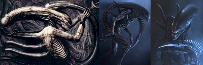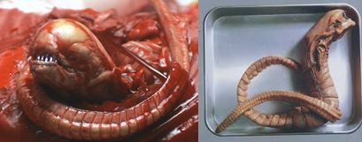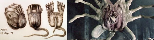 1.2 การออกแบบเอเลี่ยน ในหัวข้อนี้จะแบ่งเป็นการออกแบบเอเลี่ยนและเอเลี่ยนในวัยต่างๆได้แก่ เฟซฮักเกอร์ (Facehugger) และเชสเบิร์สเตอร์ (Chestburster) โดยผู้ออกแบบสัตว์ประหลาดแห่งฝันร้ายทั้งหมดนี้ คือ ฮานส์ รูดอล์ฟ กีเกอร์ (Hans Ruedi Giger) หรือที่รู้จักกันในนาม เฮช อาร์ กีเกอร์ (H.R.Giger) ศิลปินชาวสวิสเซอร์แลนด์ผู้ล่วงลับซึ่งเป็นการผสมผสานความน่าเกรงขามตามแบบฉบับของสัตว์ประหลาดจักรกลชีวะ (Biomechanics) สีดำทะมึนแห่งห้วงจักรวาลกับเรื่องของเพศได้อย่างแยบยล