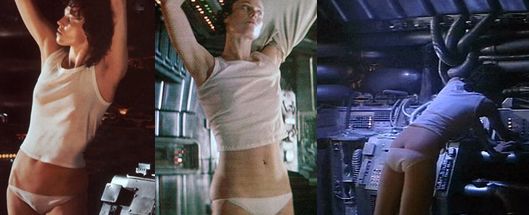 2.2.4 มุมมองของเพศชาย (Male Gaze) กับฉากสุดท้ายของภาพยนตร์ ในตอนจบของเรื่องต่างเป็นที่วิพากษ์วิจารณ์กันมากมาย เมื่อริปลี่ย์ที่เป็นหญิงแกร่งมาตลอดทั้งเรื่อง กลับเปลื้องผ้าออกจนเหลือเพียงแค่ชุดเสื้อกล้ามและกางเกงชั้นในสีขาว ก่อนจะกลับเข้าไปนอนในแคปซูลจำศีลเหมือนตอนต้น ฉากนั้นกินเวลานานพอที่จะทำให้คนดูอึดอัดและตั้งข้อสงสัยกับภาพยนตร์ได้ว่าสุดท้ายแล้วภาพยนตร์เรื่องนี้ต้องการแสดงแนวคิดของสตรีนิยมจริงหรือ โดยเป็นการแสดงให้เห็นถึงความเป็นผู้หญิงที่อ่อนแอของ ริปลี่ย์ เพราะเธอไม่อยู่ในสถานะที่พร้อมต่อสู้หรือป้องกันตัวเองได้ รวมไปถึงยังมีท่าทางหวาดกลัวให้เห็นอยู่บนใบหน้า แต่การแสดงฉากแบบนี้ถือเป็นเรื่องปกติในภาพยนตร์สยองขวัญที่ต้องมีฉากบังคับอยู่คู่กันมาของหนังประเภทนี้ ได้แก่ ฉากที่เปิดเผยเรือนร่างของตัวละครหญิงอย่างน้อยหนึ่งคนในหนังสยองขวัญ เพื่อเปลี่ยนผู้หญิงให้เป็นวัตถุทางเพศ (Sex Object) ตอบสนองคนดูภาพยนตร์แนวนี้ที่ส่วนใหญ่เป็นเพศชาย