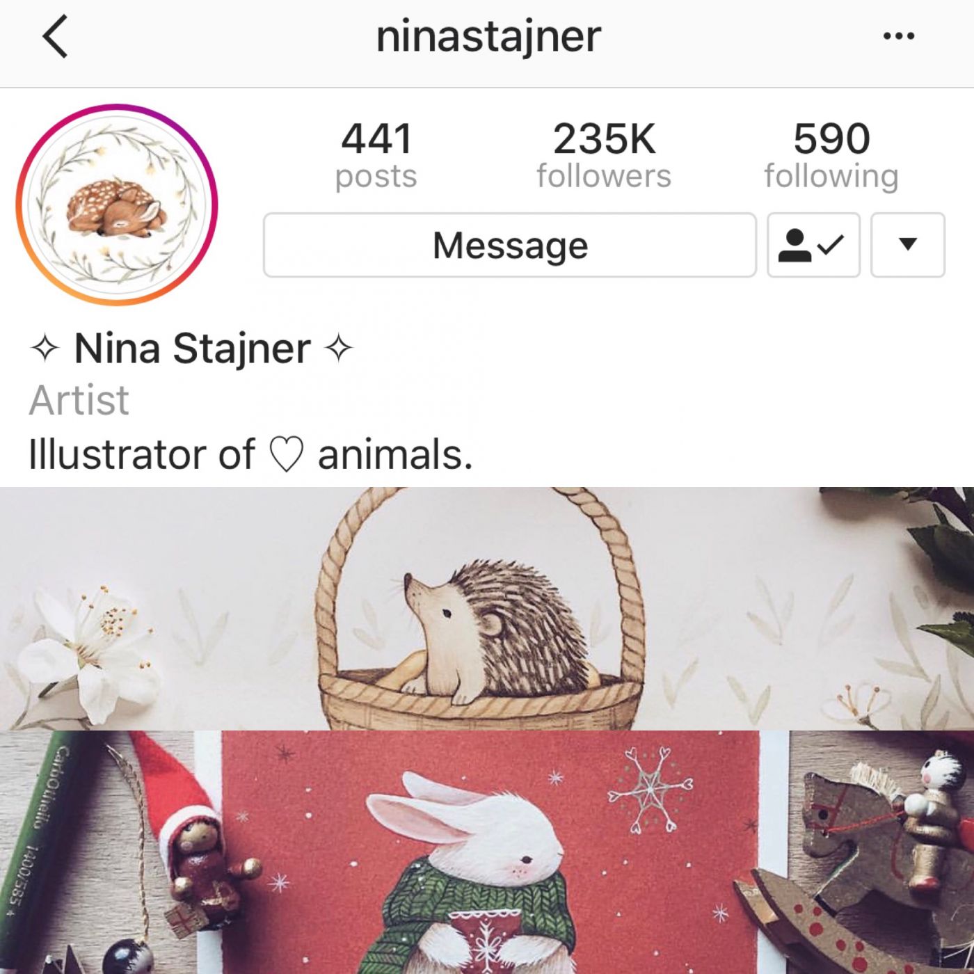 Nina คือคนที่วาดรูปได้ละเอียดมาก เส้นบางมาก งานส่วนใหญ่เค้าจะใช้พู่กันเป็นหลักเลย พู่กันเบอร์เล็กมาก ระดับน่าจะอยู่ที่เบอร์ 1-2 ได้ ลงสีละเอียดแบบเหมือนมีขนของสัตว์นุ่มๆที่สัมผัสได้เลย ตามไปดูงานด้วยตัวเองเลยฮะ เค้ามีทำเป็นของขาย หลายอย่างเหมือนกัน อย่างเช่น โปสการ์ด เข็มกลัด กระดาษห่อของขวัญ ฯลฯ น่ารักๆทั้งนั้น ใครชอบงายเส้นละเอียดๆแบบนี้ห้ามพลาดไปติดตามเค้ากันเลย