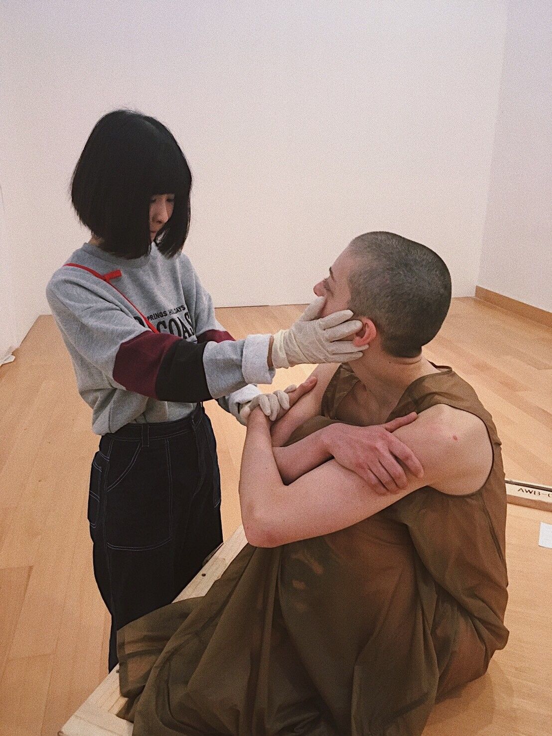 หมีก็เหมือนกัน (ว้ายยย) ตอนแรกหมีไม่ได้คิดจะเข้าไปชมงานแสดงสดชิ้นนี้เลย เพราะเขาจัดในห้องที่มีผ้าม่านสีขาวทึบปิดไว้ คนที่จะเข้าไปดูจะต้องอ่านข้อกำหนดและเซ็นสัญญายอมรับข้อกำหนดนั้น หากเข้าใจกับกฎเกณฑ์เหล่านั้นแล้ว ทางเจ้าหน้าที่จะมีถุงมือยางให้สวมใส่ ก่อนจะปล่อยให้เข้าไปชมภายในค่ะ