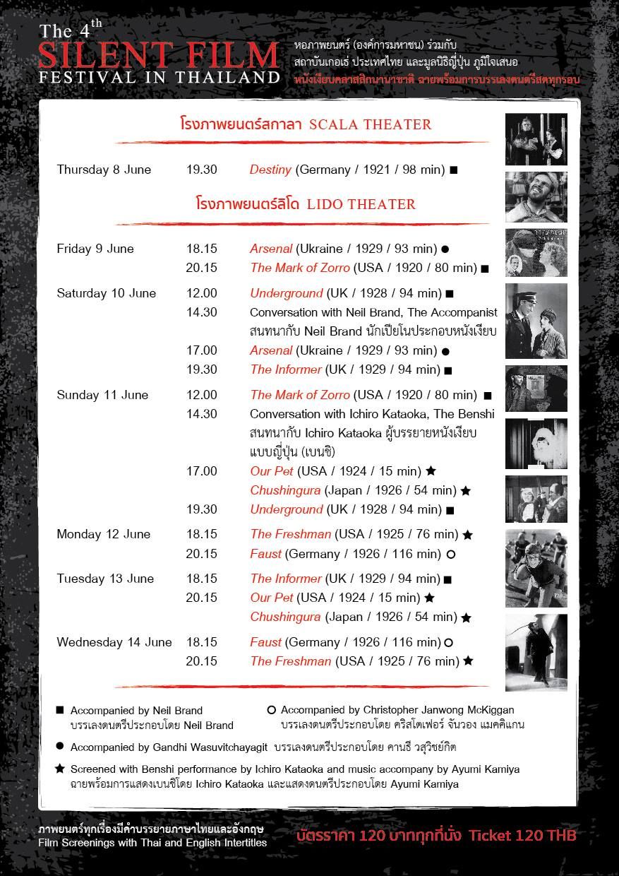 สำหรับงานเทศกาลภาพยนต์เงียบครั้งที่ 4 นี้นะคะ จัดขึ้นที่โรงภาพยนต์สกาล่าและลิโด้ ตั้งแต่วันพฤหัสบดีที่ 8 นี้ จนถึงวันพุธที่ 14 มิถุนายนค่ะ