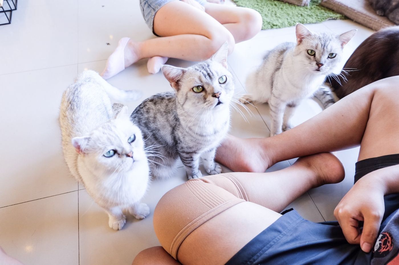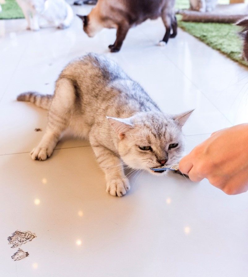 โดยปกติแล้วน้องๆ จะหลับในเวลากลางวัน ถ้าอยากถ่ายรูปกับน้องก็อาจจะต้องใช้ขนมล่อนิดหน่อย โดยที่ร้านจะมีขนมแมวเลียกับขนมแบบแท่งให้ซื้อเพื่อล่อแมวโดยเฉพาะ เพื่อนหมีซื้อขนมแมวเลียมาเพราะนางบอกว่าแมวส่วนมากจะชอบแบบนี้มากกว่า (กลิ่นมันแรงกว่าแหละ หมีมารู้ทีหลัง) พอได้ขนมมา ฉีกซองปั๊บ แมวทุกตัวที่หลับก็ตื่นมาล้อมหน้าล้อมหลังราวกับซอมบี้เลยค่ะ