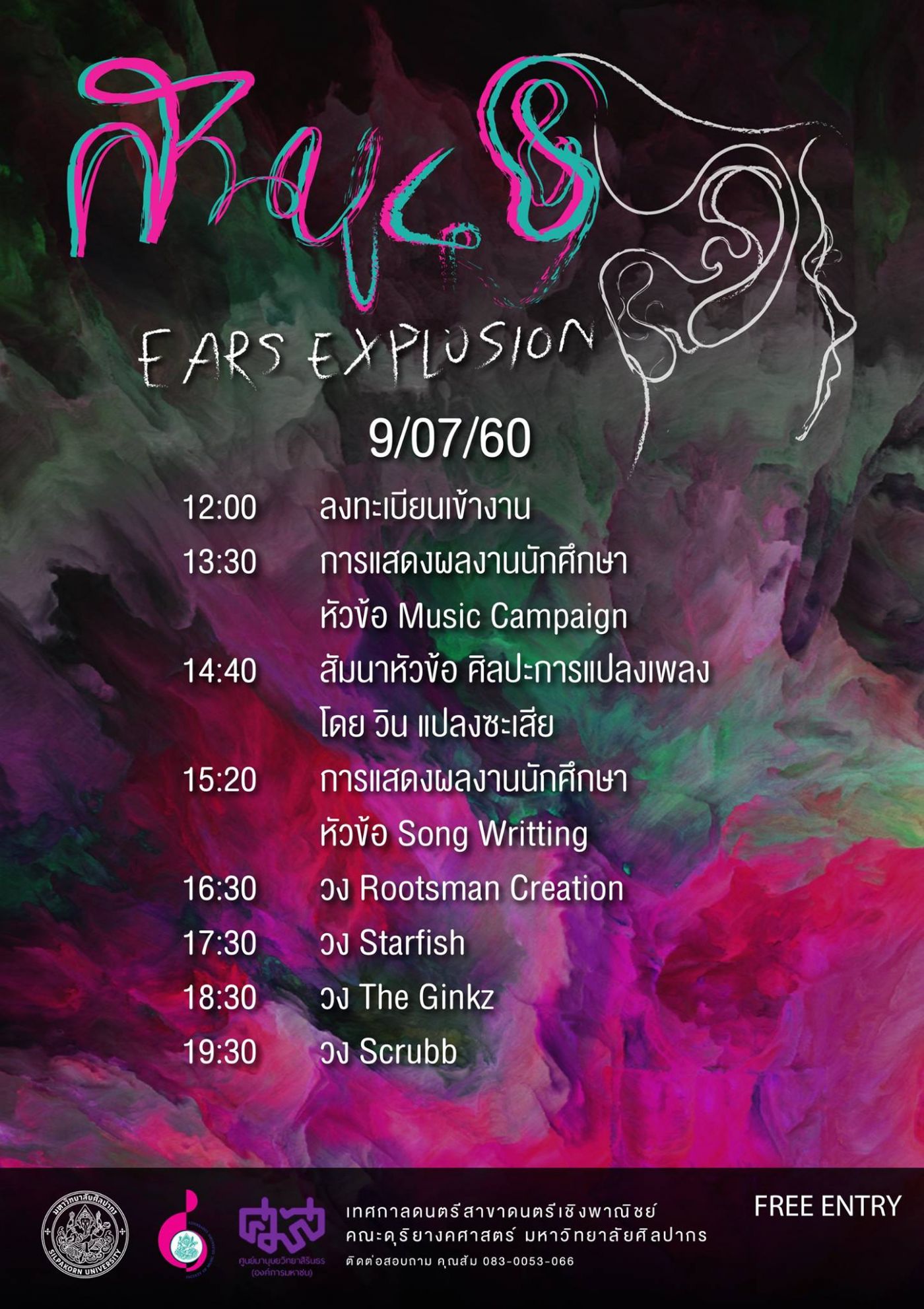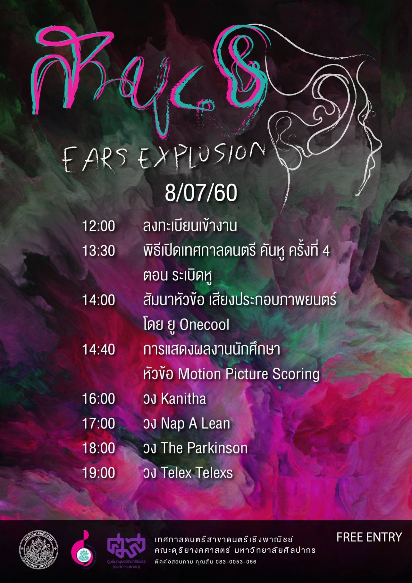 งานคันหู (ขอเรียกย่อๆ แบบนี้นะ) เป็นงานที่จัดขึ้นเพื่อนำเสนอผลงานการแสดงจบของนักศึกษาคณะดุริยางคศาสตร์ มหาวิทยาลัยศิลปากรค่ะ ซึ่งจัดขึ้นมาได้ 4 ครั้งแล้ว ตามจำนวนที่เราเห็นต่อท้ายชื่องานเนาะ โดยในครั้งนี้ใช้ชื่อตอนว่า "ระเบิดหู" ค่ะ จัดขึ้นตั้งแต่วันที่ 8-9 ก.ค. 2560 หรือก็คือ "วันนี้" ที่หมีไปมา และ "วันพรุ่งนี้" เป็นวันสุดท้าย