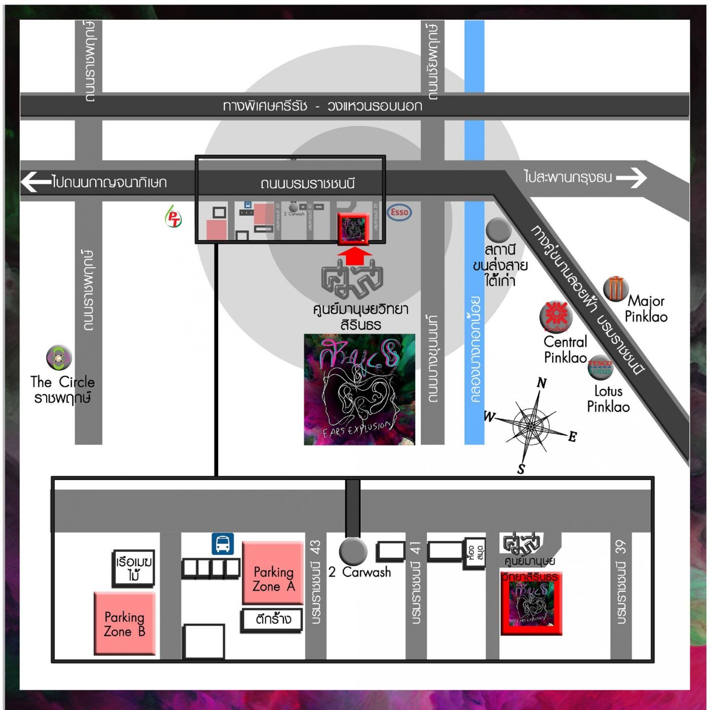 งานนี้ถูกจัดขึ้นที่ศูนย์มนุษยวิทยาสิรินธร ตั้งอยู่บนถนนบรมราชชนนี หรือที่เด็กศิลปากรจะเรียกกันว่าวิทยาเขตตลิ่งชันนะคะ สำหรับผู้ที่เดินทางโดยรถเมล์ สามารถเดินทางมาได้โดยขึ้นสายดังนี้ค่ะ 28, 56, 108, 159, 177, 183, 201, 542, 515 และสาย 539 ลงป้ายศูนย์มานุษยวิทยาสิรินธร แต่ถ้ามีรถโดยสารส่วนบุคคล ก็สามารถนำรถมาจอดได้สองจุดตามภาพเลยค่ะ โดย Parking Zone A จะอยู่หน้าตึกร้าง และ Parking Zone B จะอยู่ข้างหลังร้านเรือเมฆไม้ ซึ่งอาจจะมีการเก็บค่าที่จอดซึ่งอันนี้ทางผู้จัดงานไม่เกี่ยวข้องนะคะ