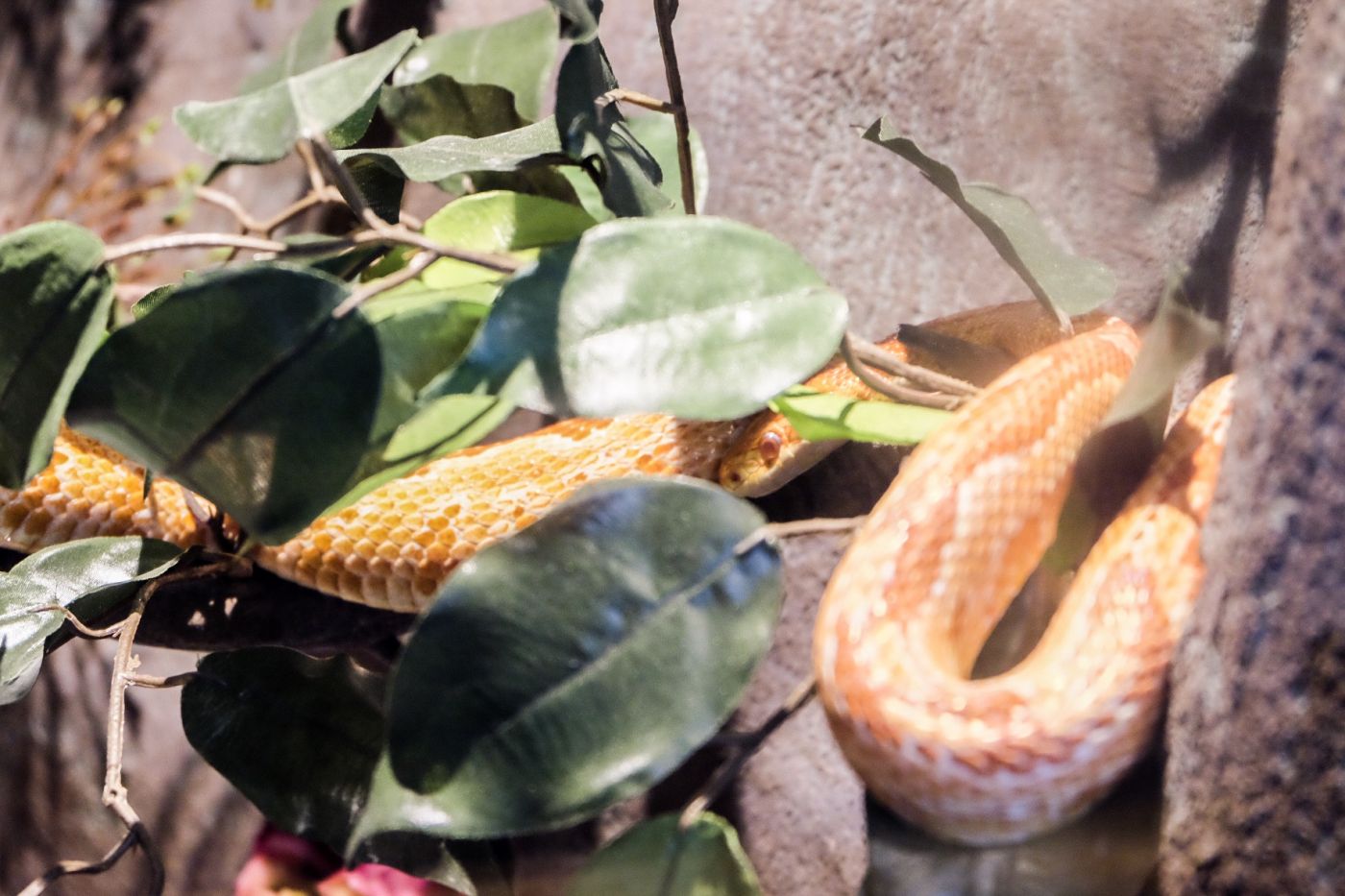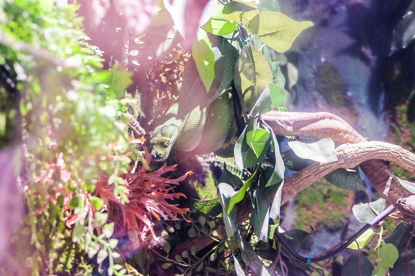โดยส่วนมากแล้วน้องงูจะหลบๆ ซ่อนๆ อยู่ตามมุมตู้ ไม่ก็ในที่มืดๆ หลังต้นไม้ ใบไม้ ซึ่งหมีต้องใช้ความพยายามอย่างมากในการเพ่งหา และส่องกล้องเข้าไปที่กระจกเพื่อซูมถ่ายออกมา เหตุผลที่เป็นอย่างนั้นเพราะโดยมากแล้วงูจะตัวไม่ใหญ่ค่ะ บางตัวเล็กกว่าข้อมือหมีอีก แล้วน้องก็แอบๆ ซ่อนๆ หลับอยู่ ไม่ค่อยขยับตัวออกมาให้เห็นเท่าไหร่