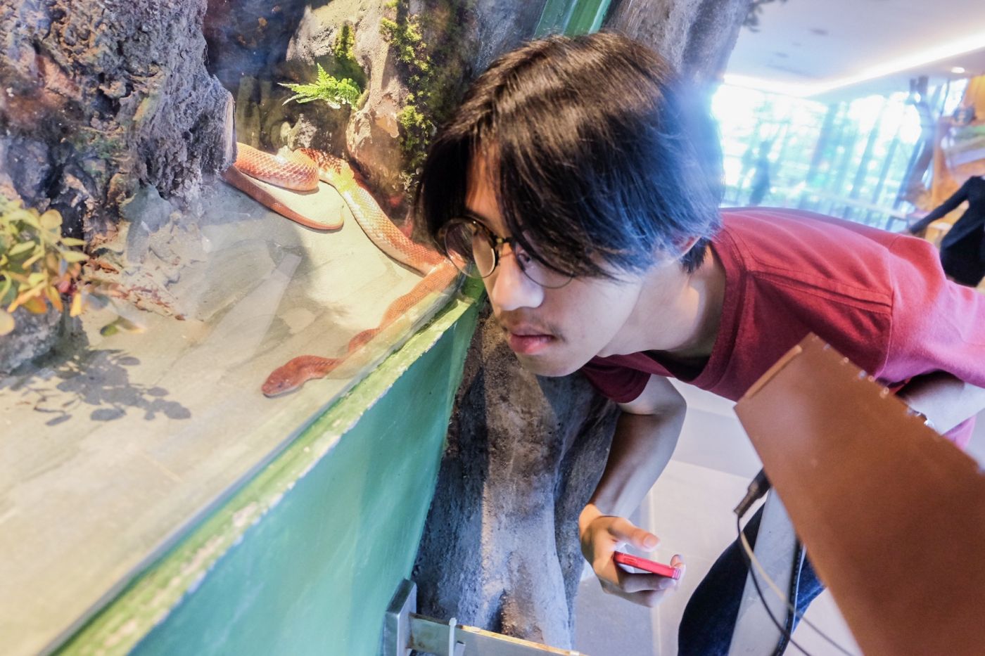 พอพ้นจากส่วนของการให้ความรู้เกี่ยวกับธรรมชาติโดยทั่วไปของงูแล้ว เราก็จะได้มาเจองูจริงๆ สักทีค่ะ และต้องต่อสู้กับทัวร์จีนโขยงใหญ่ด้วย โดยวิทยากรที่อยู่กับกลุ่มหมีเตือนไว้ก่อนเลยว่า ถ้าเขามาให้เราถอยเลย เพราะเขาจะไม่สนใจอะไรเราทั้งนั้น จะผลัก จะชน จะแซง และที่แย่คือพวกนางเคาะตู้กระจกที่น้องงูอาศัยอยู่ด้วย ซึ่งตรงนี้หมีว่าพนักงานเองก็พยายามบอกแล้วแหละ แต่ทัวร์เยอะมากจริงๆ มันก็คงเกินความสามารถที่จะควบคุมแล้ว