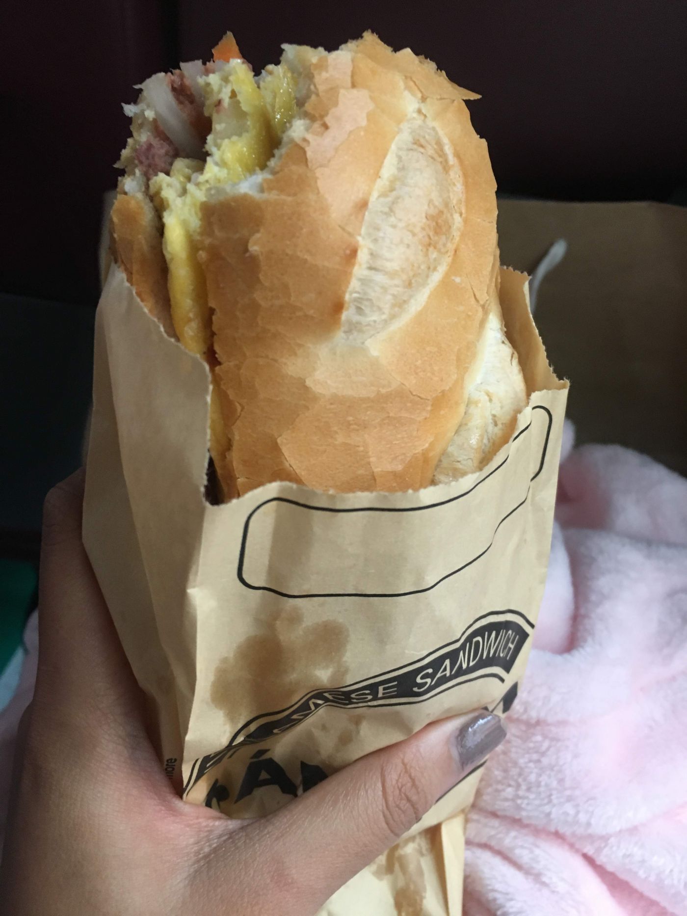 หน้าตาของ Ban Mhi ใหญ่มว้ากกกกกกก ทานกับเพื่อนสองคน คืออิ่มมากๆค่ะ อร่อยมากๆด้วย ข้างในเป็นหมูสับละเอียดๆผสมพริกไทย และไข่รวนๆ เจ้าขนมปังเนี่ย กรอบนอกนุ่มใน ไม่จืด ไม่ฝาด อร่อยมากๆ แนะนำค่ะ ทุกคนต้องทาน ชิ้นละ 30.000 VDN หรือประมาณ 45 บาทเท่านั้นเองง