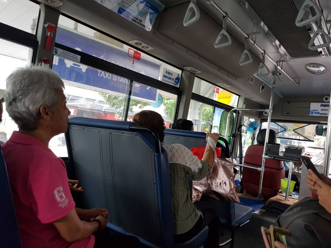 เมื่อเราเดินออกมาจากประตูสนามบินแล้ว สิ่งแรกที่ต้องทำเลย มองค่ะ! มองหา เจ้ารถเมล์ สาย ที่จะพาเราเข้าเมืองโฮจิมินห์นั่นเอง ค่าโดยสารไม่แพงคะ คิดเป็นเงินไทยประมาณ 8 บาท รถเมลล์บ้านเค้าก็สุดแสนจะทันสมัยมากๆเลย ไม่ต้องกังวลแต่อย่างใดเลยนะคะ (อินเนอร์พี่ติ้ก เจษ) บอกป้ากระเป๋ารถเมลล์ว่าไปลง "ฟาร์ม งู เหลา" ค่ะ