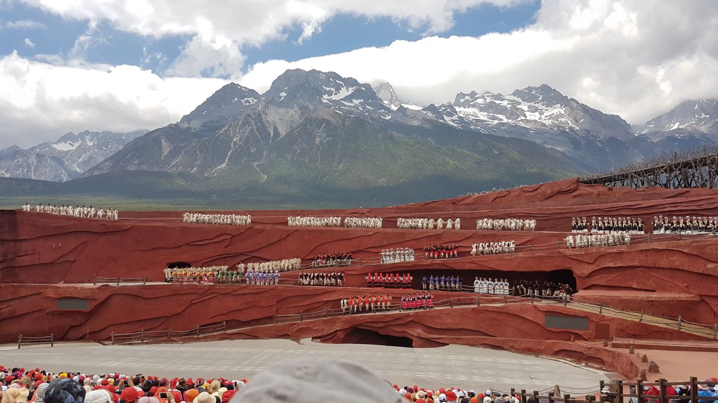 ช่วงบ่ายมาดู Impression Lijiang คือถ้ามาแล้วแนะนำให้ดูนะ เป็นโชว์อลังการมาก ละเค้ามี subtitle ภาษาอังกฤษอยู่ เป็นการแสดงเล่าเรื่อง เนื้อหาของการแสดงตามที่เราเข้าใจก็คือจะแบ่งเป็น 6 ตอน การแสดงจะสะท้อนวิถีชีวิตของชนกลุ่มน้อยและความเชื่อเกี่ยวกับความศักดิ์สิทธิ์ของเทพในภูเขาหิมะมังกรหยก (Jade dragon snow mountain) พร้อมกับฉากหลังคือภูเขาหิมะแบบนี้
