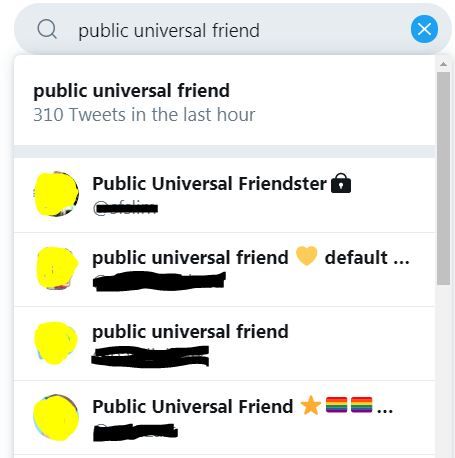 เมื่อไม่นานมานี้ Public Universal Friend ได้กลายเป็นที่สนใจในแวดวงบล็อกเกอร์ ทัมเบลอร์และทวิตเตอร์ต่าง ๆ ตอนนี้คนก็ยังพูดถึงกันอยู่เลยนะ มีทำเป็นมีมด้วย เป็นทั้งมีมทั้งไอคอน ก็เล่นกันส่วนใหญ่ในกลุ่มที่มีความหลากหลายทางเพศ(queer community) แหละค่ะ เลยลัดคิวเอามาเล่าก่อนเลยแล้วกัน