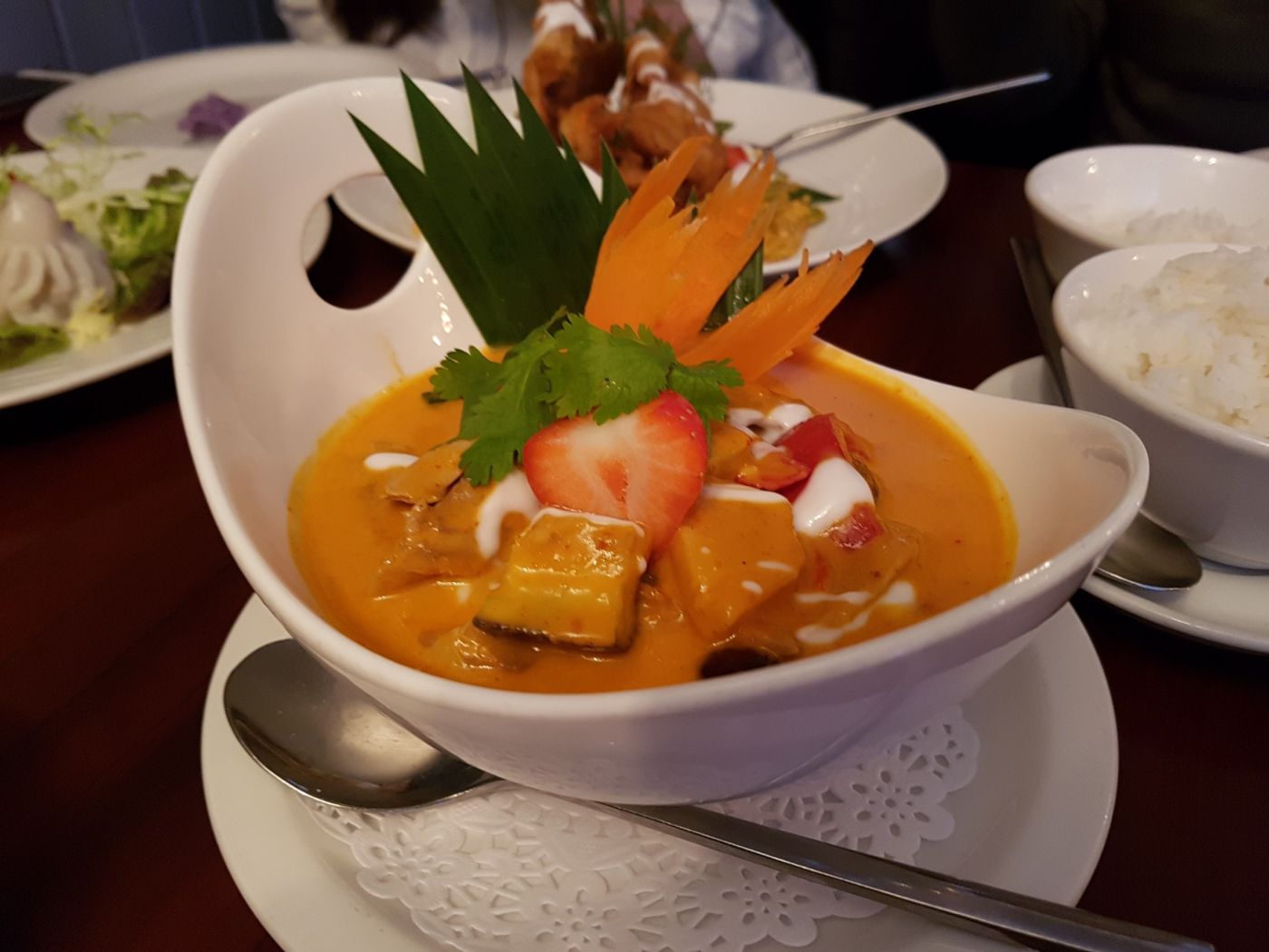 (ภาพแกงเผ็ดใส่ Strawberry พริกหวาน จากร้าน Nok's Kitchen ในกรุงเอดินเบอระ ประเทศสก็อตแลนด์ ร้านอาหารไทยบางแห่งใช้ลูกพีชใส่กับพะแนงก็มี)