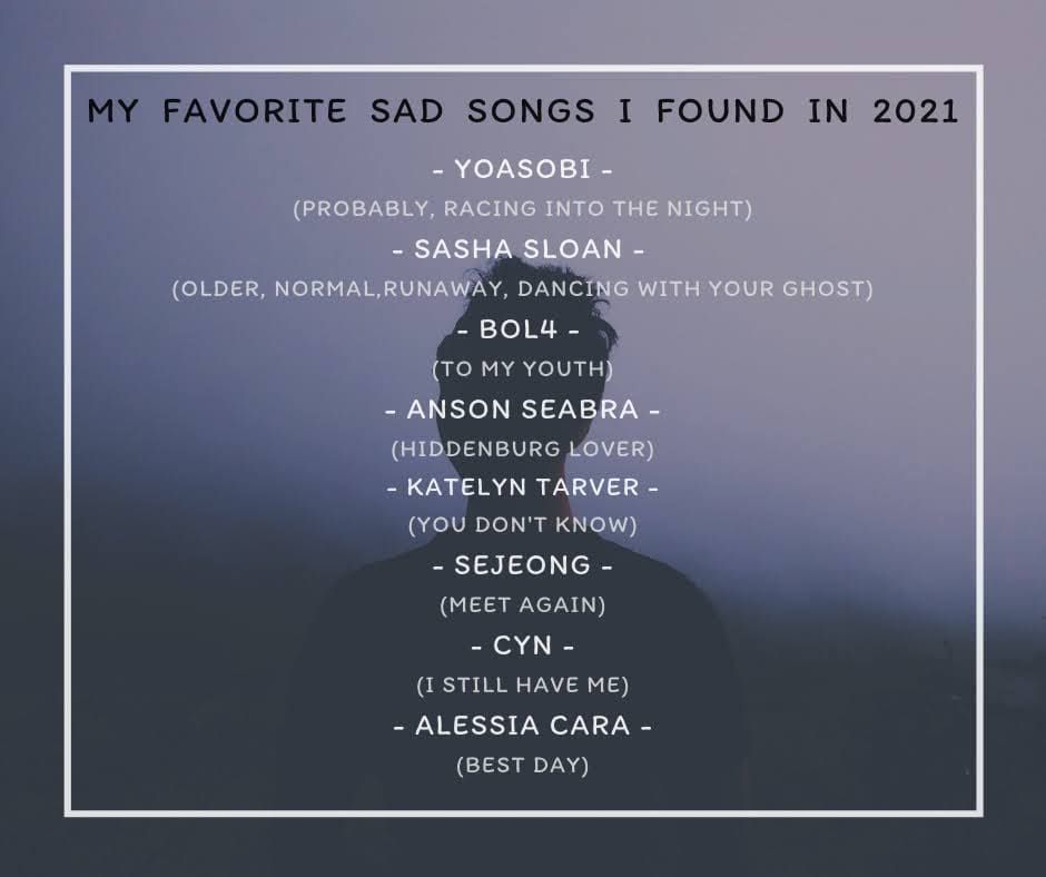 ปกติจะฟังเพลงแดนซ์มากกว่าเพลงเศร้า แต่ปี 2021 เป็นปีที่ทำให้สภาพจิตใจดิ่งลงจนต้องพบจิตแพทย์ แต่ก็ไม่ได้มีเงินไปพบได้บ่อยๆ บางครั้งก็ใช้เพลงเป็นตัวช่วยปลดปล่อยอารมณ์เศร้าที่สะสมอยู่ภายในใจ (เพื่อจะได้ฝืนทำตัวปกติในระหว่างวันขณะทำงานได้) ซึ่งเพลงที่มันตรงกับสภาพของเราจนทำให้ฟังแล้วน้ำตาไหลได้ก็มีหลายเพลง เท่าที่พอจะสรุปมาได้ก็็มีตามภาพ