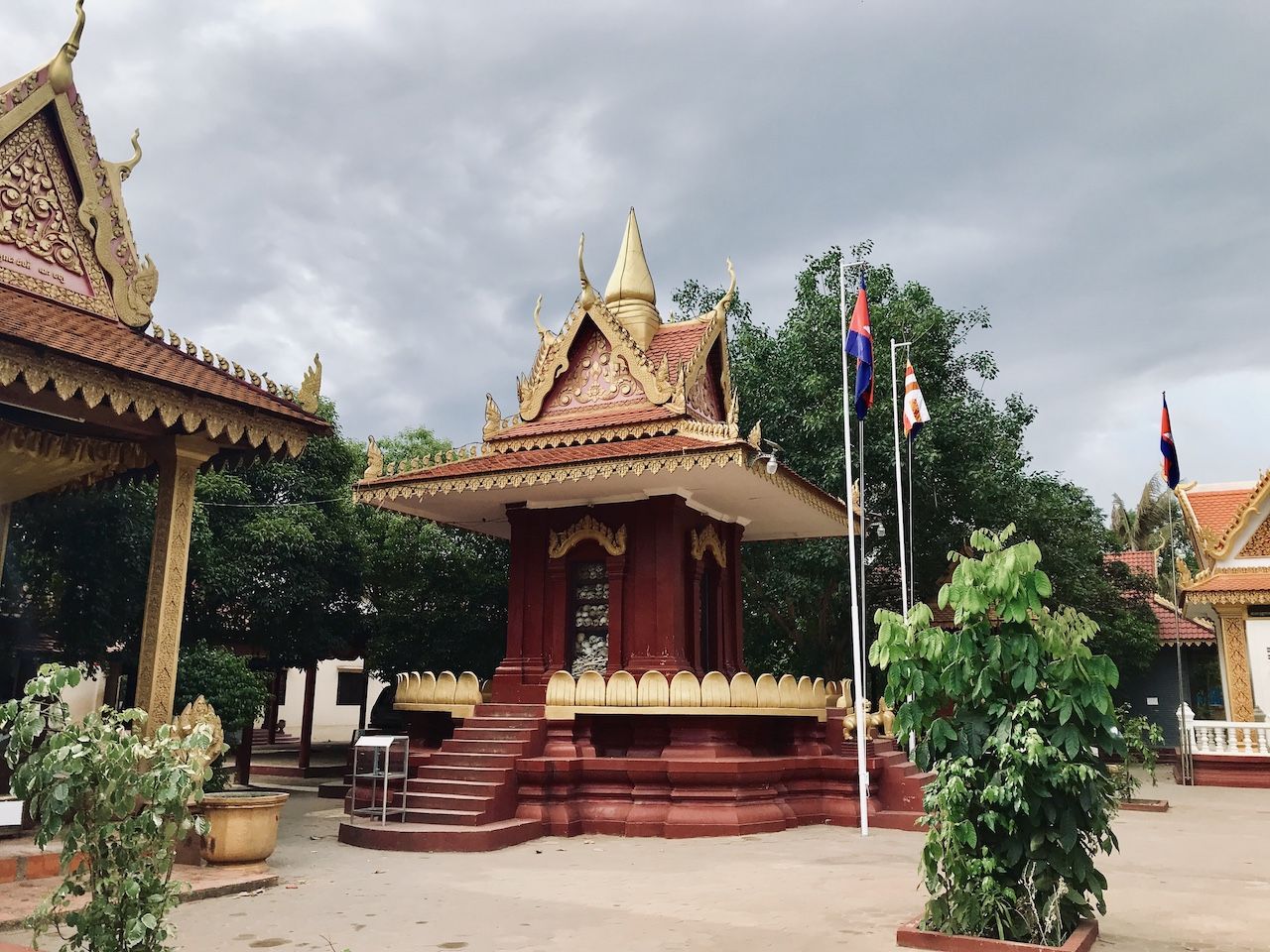 สภาพโดยรอบของวัดแห่งนี้ก็เหมือนกับวัดพุทธทั่ว ๆ ไปนั่นแหละค่ะ คล้าย ๆ กับวัดที่ไทยเลย แต่เห็นว่าเขามีติดป้ายไวนิลไว้รอบ ๆ ลุงวันแกก็จอดรถแล้วก็พาเดินดุ่ม ๆ เข้าไปให้เราอ่านตรงป้ายพร้อมกับชี้มืออธิบายเป็นภาษาไทยจับใจความได้ว่า วัดแห่งนี้เป็นวัดที่เก็บกระดูกของชาวกัมพูชาที่เสียชีวิตในช่วงสงครามกลางเมือง ค่ะ