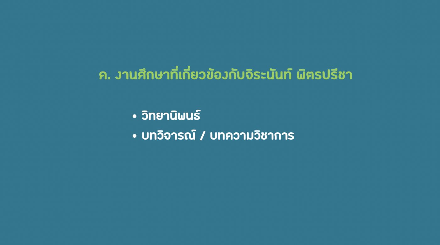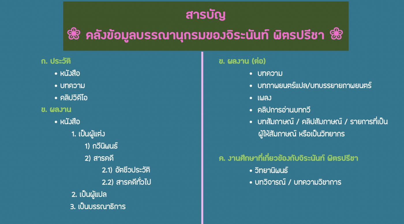 การจัดทำคลังข้อมูลนี้ เป็นส่วนหนึ่งของการเรียนการสอนในรายวิชา 2201252 วิวัฒนาการวรรณกรรมไทย มีวัตถุประสงค์เพื่อรวบรวมและเรียบเรียงบรรณานุกรมใน "สื่อสิงพิมพ์" และ "สื่อออนไลน์" ที่เกี่ยวข้องกับ คุณจิระนันท์ พิตรปรีชาเพื่อประโยชน์ทางการศึกษาเท่านั้น ไม่อนุญาตให้ผู้ใดนำไปใช้ในการค้าหรือเพื่อแสวงหาผลกำไรใดๆ ทั้งสิ้น