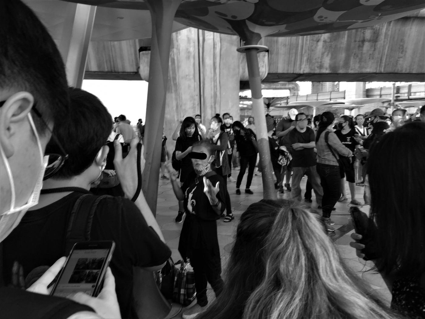 หลังจากคุยกันสักพัก ชายผมขาวท่านนึงเดินแหวกกล้องและนักข่าวออกมาจากวงพร้อมกับตะโกนบอกให้ทุกคนช่วยยืนห่างๆกันหน่อย เพื่อความสบายใจของทุกฝ่ายและเป็นการช่วยเซฟน้องๆนิสิตที่เป็นผู้นำกิจกรรม เพราะหลังจากจบวันนี้ไป ไม่รู้จะมีใครโดนข้อหาอะไรบ้าง ทุกคนที่อยู่ในบริเวณต่างพากันถอยและขยับออกจากกันแต่ก็ไม่มีใครขยับไปไกล เหมือนทำกันพอเป็นพิธีไม่ให้ดูแน่นระหว่างยืนรอเวลาตามกำหนดการณ์อย่างใจจดใจจ่อ ระหว่างที่รอ  ในขณะทุกคนที่บนสกายวอร์กต่างใส่หน้ากากอนามัยอยู่ตลอดซึ่งเอาเข้าจริงๆ ผมว่าในใจๆหลายคนคงคิดว่าไม่จำเป็นต้องใส่ก็ได้ แต่ด้วยความรับผิดชอบที่มีต่อคนอื่น  ทุกคนเลือกมารยาททางสังคมและพยายามปฏิบัติตามกติกาในช่วงโรคระบาดยังงี้อย่างไม่ถกเถียง