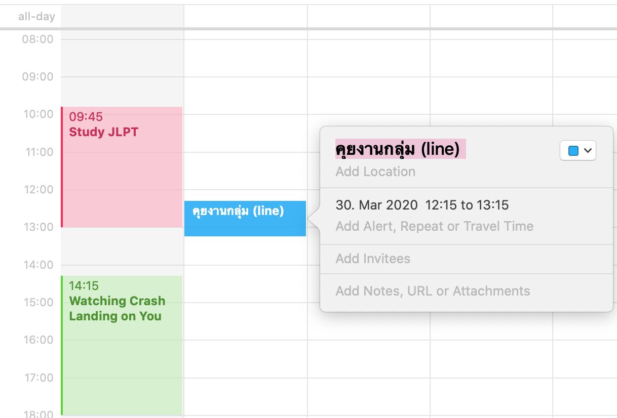 พระเอกของเราในการวางแผนชีวิตคือแอป Calendar ในโทรศัพท์นี่เอง เราก็จะใช้ฟังก์ชั่น time-boxing ในหมวด Week ในการกำหนดกิจกรรมโดยคร่าวของอาทิตย์นี้ (อย่ายัดเกินสามอย่างต่อวันนะ) ว่าวันนี้เราจะทำอะไรบ้าง แยกสีให้ชัดเจน สมมติว่า สีแดง เกี่ยวกับการเรียน (e.g. งานที่ต้องส่ง, สอบ, วางแผนการอ่านหนังสือ) สีฟ้า เกี่ยวกับจ็อบเสริม (e.g. สอนพิเศษ, ตัดต่อวิดีโอ) สีเขียว เกี่ยวกับการอู้ (ดูหนัง ซีรีส์ เล่นเกม ดู youtube)