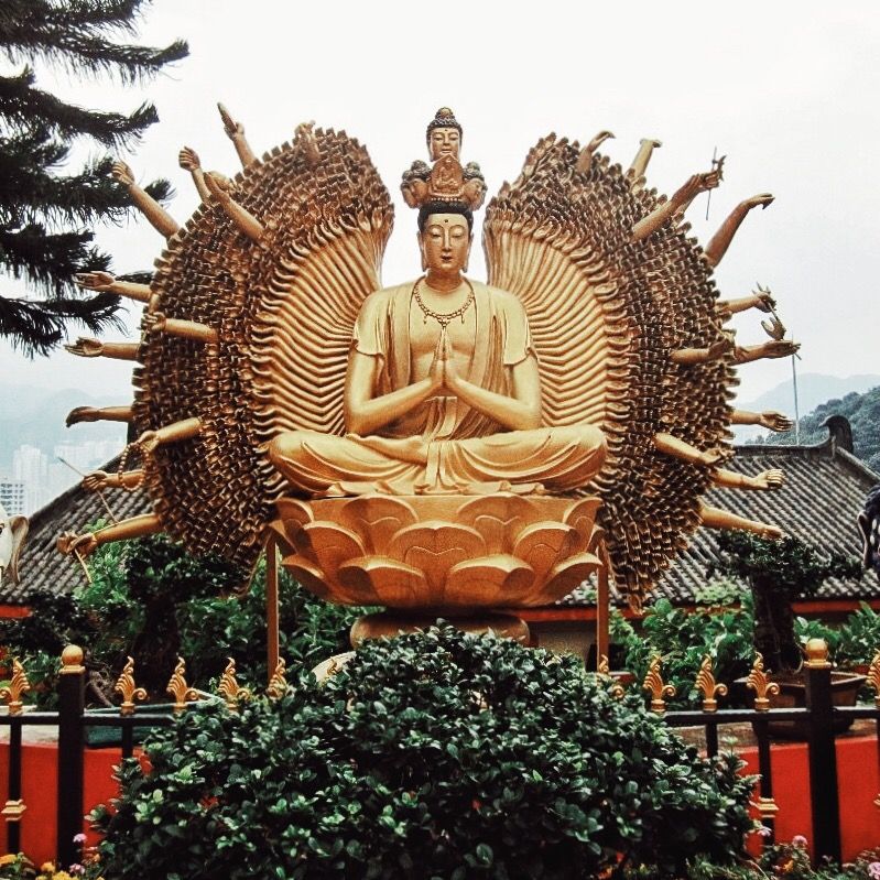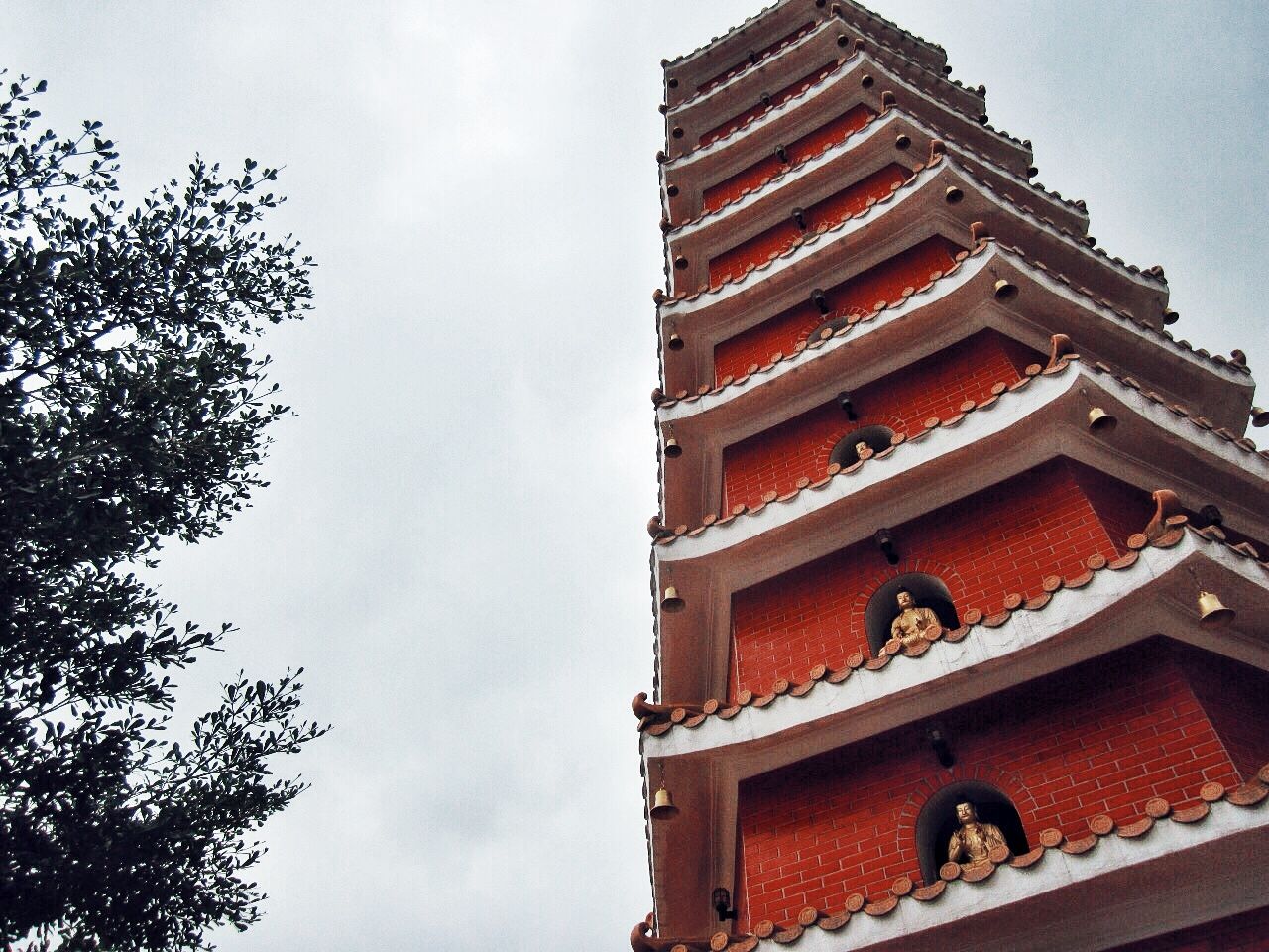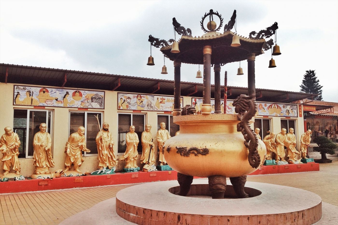 ภายในบริเวณวัดมีวิหารหลัก เจดีย์เก้าชั้นสีแดงตั้งเด่นเป็นสง่า ด้วยความที่ความรู้ทางด้านสถาปัตยกรรมศาสตร์ด้อยนัก จึงไม่แน่ใจว่าเป็นศิลปะแบบไหน แต่เอาจริงๆก็พอจะคุ้น ๆ อยู่บ้าง เพราะเป็นเจดีย์ที่ปรากฏบนธนบัตร 100 ฮ่องกงดอลลาร์ ใกล้ ๆ กันนั้นเป็นวิหารที่บรรจุพระพุทธรูปทองคำองค์เล็ก ๆ สีทองอร่ามตั้งเรียงรายอยู่รอบๆผนังถึง 12,800 องค์ แต่มีป้ายแปะไว้ว่าไม่ให้ถ่ายรูป จึงอดเก็บรูปสวย ๆ มาฝาก ออกจากวิหารตรงโถงกลาง ฉันแวะทานอาหารมังสวิรัติภายในวัด ซึ่งรสชาติอร่อยมาก จนต้องซื้อกลับ ทั้งของตัวเอง และเอาไปฝากพี่เสี่ยวลี่อีกหนึ่งชุดด้วย