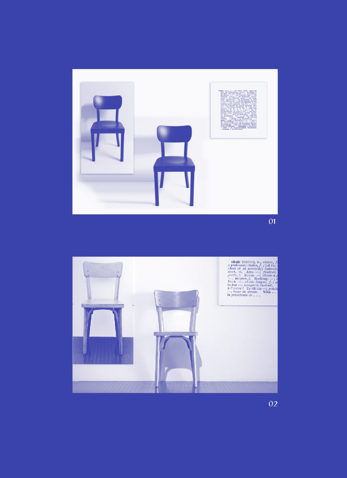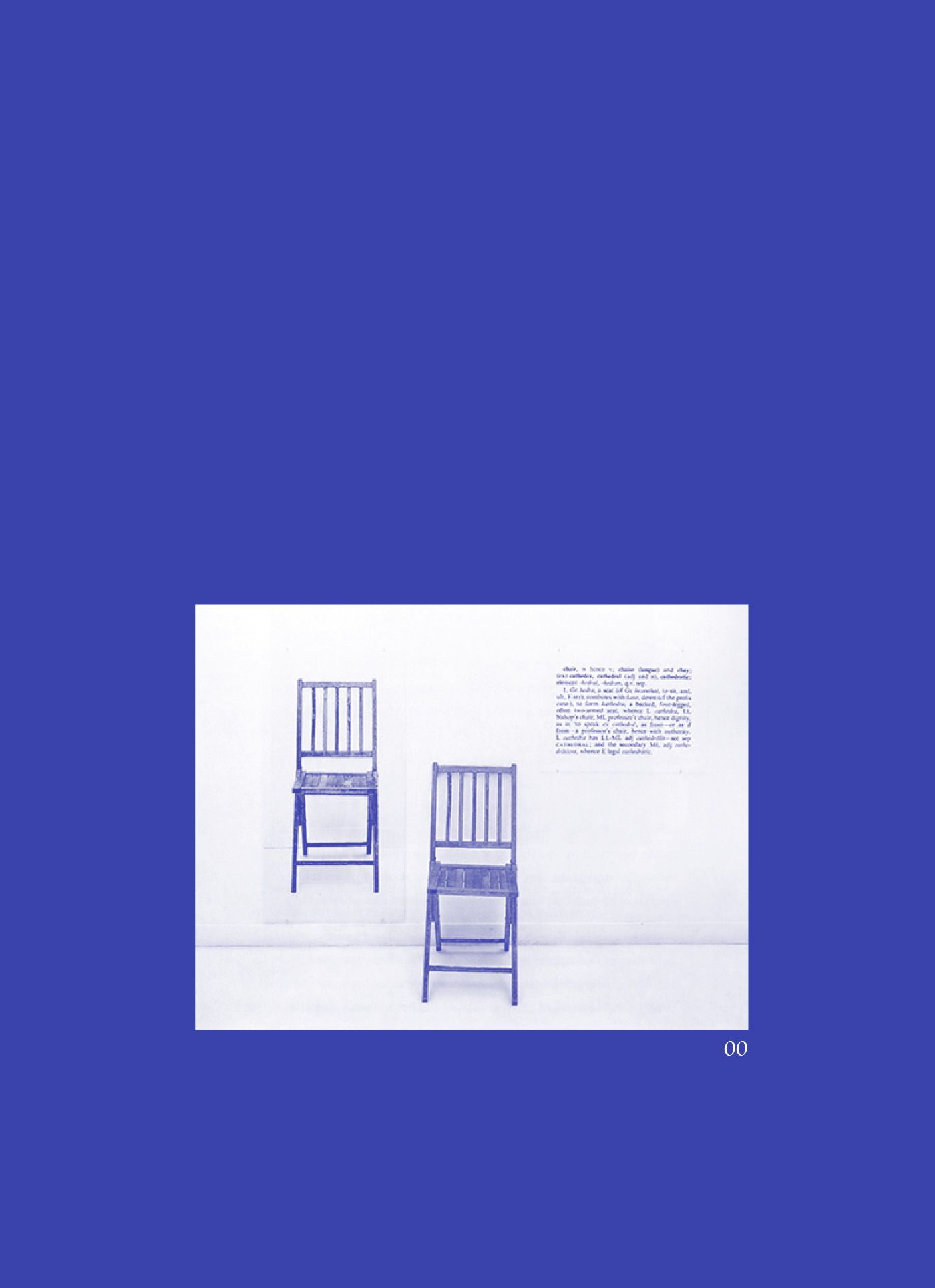 ผลงานศิลปะจัดวางชิ้นนี้ประกอบด้วยเก้าอี้หนึ่งตัว ภาพถ่ายเก้าอี้ขนาดเท่าของจริง (เป็นภาพถ่ายของเก้าอี้ที่ตั้งอยู่ในห้องแสดงงาน) และกระดาษสำเนาขนาดใหญ่ที่พิมพ์ความหมายของคำว่า ‘เก้าอี้’ จากพจนานุกรมลงไป