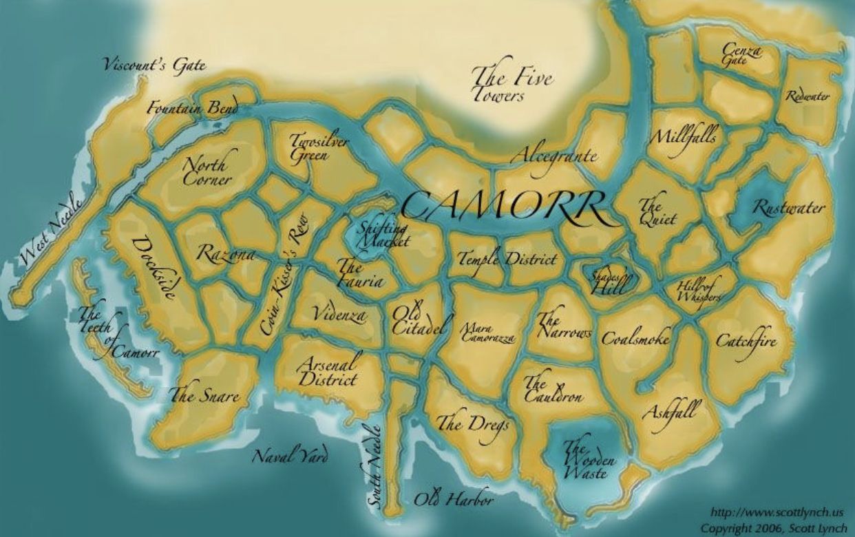 ในเล่มเเรกนี้เซตติ้งทั้งหมดจะอยู่ในคามอร์ค่ะ โดยคามอร์ในความคิดเราเป็นเหมือนเมืองๆหนึ่งในโลกนี้(ภายในเล่มได้มีการเอ่ยถึงเมืองอื่นๆด้วย คาดว่าจะปรากฏเป็นเซ็ตติ้งในเล่มถัดๆไป) เเละในคามอร์ก็จะเเบ่งย่อยเป็นเขตต่างๆมากมายหลายเขตอีกที (ล็อกของเรามาจากเขตเริงไฟ หรือ Catchfire ที่มุมล่างขวาตามในแผนที่ค่ะ) เขตที่ปรากฏหลักๆเเละเป็นเขตที่เกิดเรื่องราวต่างๆ ได้เเก่ เขตหม้อเหล็ก ซากไม้ เถ้าตก เขตเงียบ แดนเเคบ ถิ่นกาก ตลาดลอยน้ำ เขตวิหาร เขตเริงไฟ หุบเขาเสียงกระซิบ เวิ้งก้อง เขตน้ำสนิม หุบเขาเงามืด ย่านผู้จูบเหรียญ ชุมชนนักคัดลอก ย่านน่านับถือ (เราชื่นชอบวิธีการตั้งชื่อเขตรวมถึงเวลาแปลออกมาเป็นภาษาไทยมากๆ ดูสร้างสรรค์ไม่เหมือนใครดี)