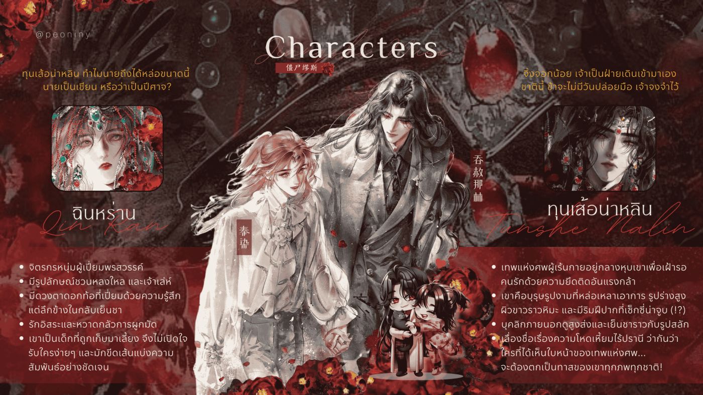 ตัวละคร ฉินหร่าน จิตรกรหนุ่มผู้เปี่ยมพรสวรรค์และมีรูปลักษณ์ชวนหลงใหล เขามีทั้งความเจ้าเล่ห์และอารมณ์ศิลปินที่คาดเดายาก ในอดีตเคยบอบช้ำจากการเป็นเด็กกำพร้าที่ถูกเก็บมาเลี้ยงจึงไม่เปิดรับใครง่ายๆ และขีดเส้นแบ่งความสัมพันธ์กับทุกคนอย่างชัดเจน แม้จะมีดวงตาดอกท้อที่เปี่ยมด้วยความรู้สึก แต่ลึกข้างในกลับเย็นชามาก เป็นคนรักอิสระและหวาดกลัวการผูกมัด // ฉันกลัวการแต่งงาน แต่ดันกลายเป็นชายาเทพที่แต่งให้เทพแห่งศพ ( ; ω ; )
