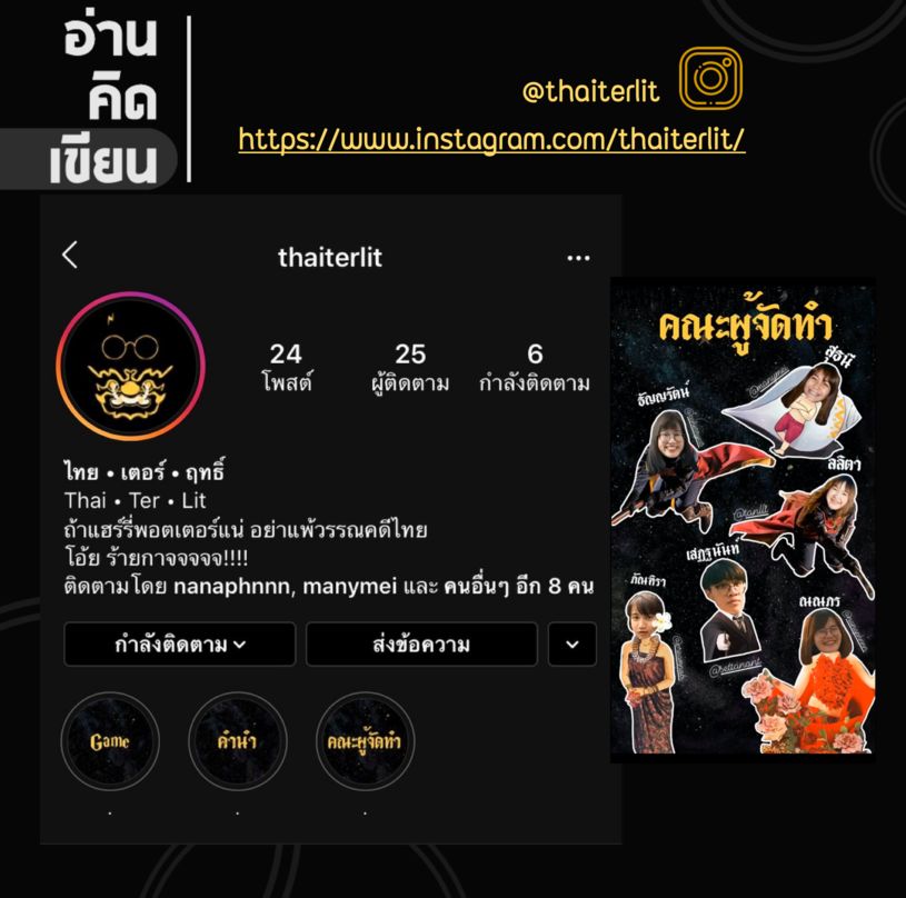 ติดตามได้ใน instagram @thaiterlit Thai Lit x Harry Potter คลิกเลยที่นี่ ชื่อกลุ่ม: "โคโรน่าทดน้ำ"