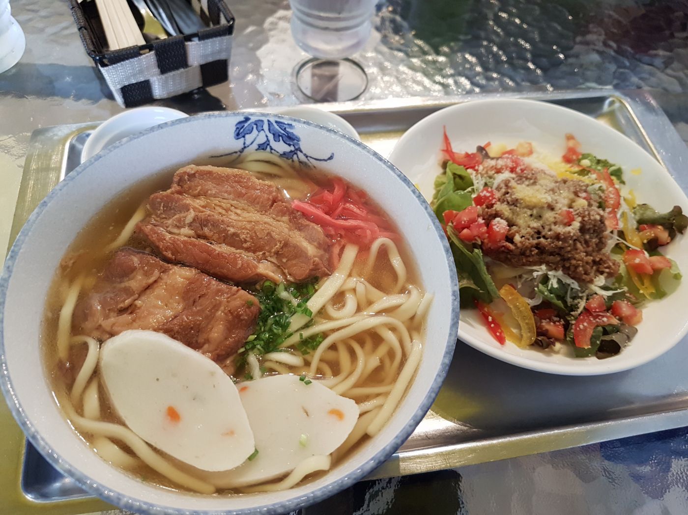 แล้วมื้อแรกของเราก็ต้องของขึ้นชื่อของที่นี่แหละ นั่นก็คือ โอกินาว่าโซบะ เองจ้าาา หมูชิ้นใหญ่ นุ่ม อร่อยมากกก พอกินเสร็จก็นั่งบัสไปปราสาทนาคิจิน (今帰仁城跡;Nakijin Castle Remains) แต่บัสไปไม่ถึงนะ ต้องลงแล้วค่อยต่อรถชัตฟรีขึ้นไป